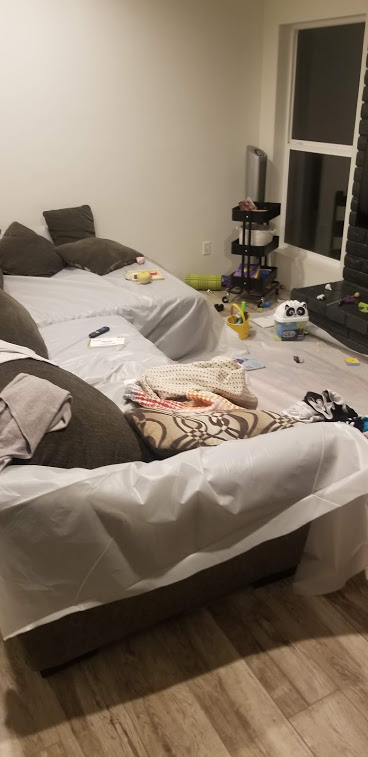 Potty training, is one of the hardest things we have every had to do with our child. I hate changing diapers, but sometimes wonder if that is just easier than this. So we when to a crash course on potty training, one week of none stop pottying in a big potty. The book said there would be accidents, and not to worry it will be over in a week. But I did not want to risk it, so I covered up our couches and rug with plastic. Here is what it looks like.