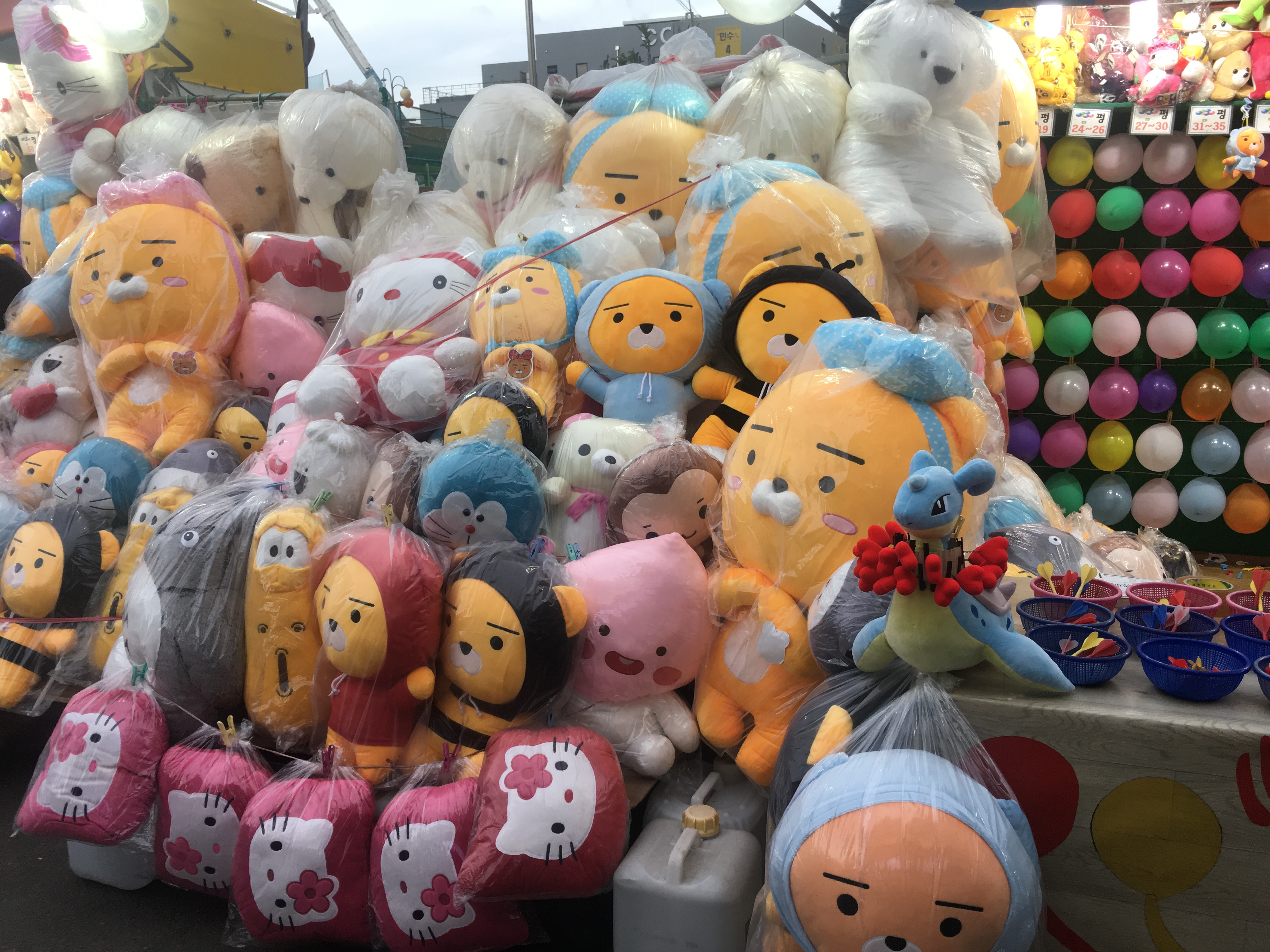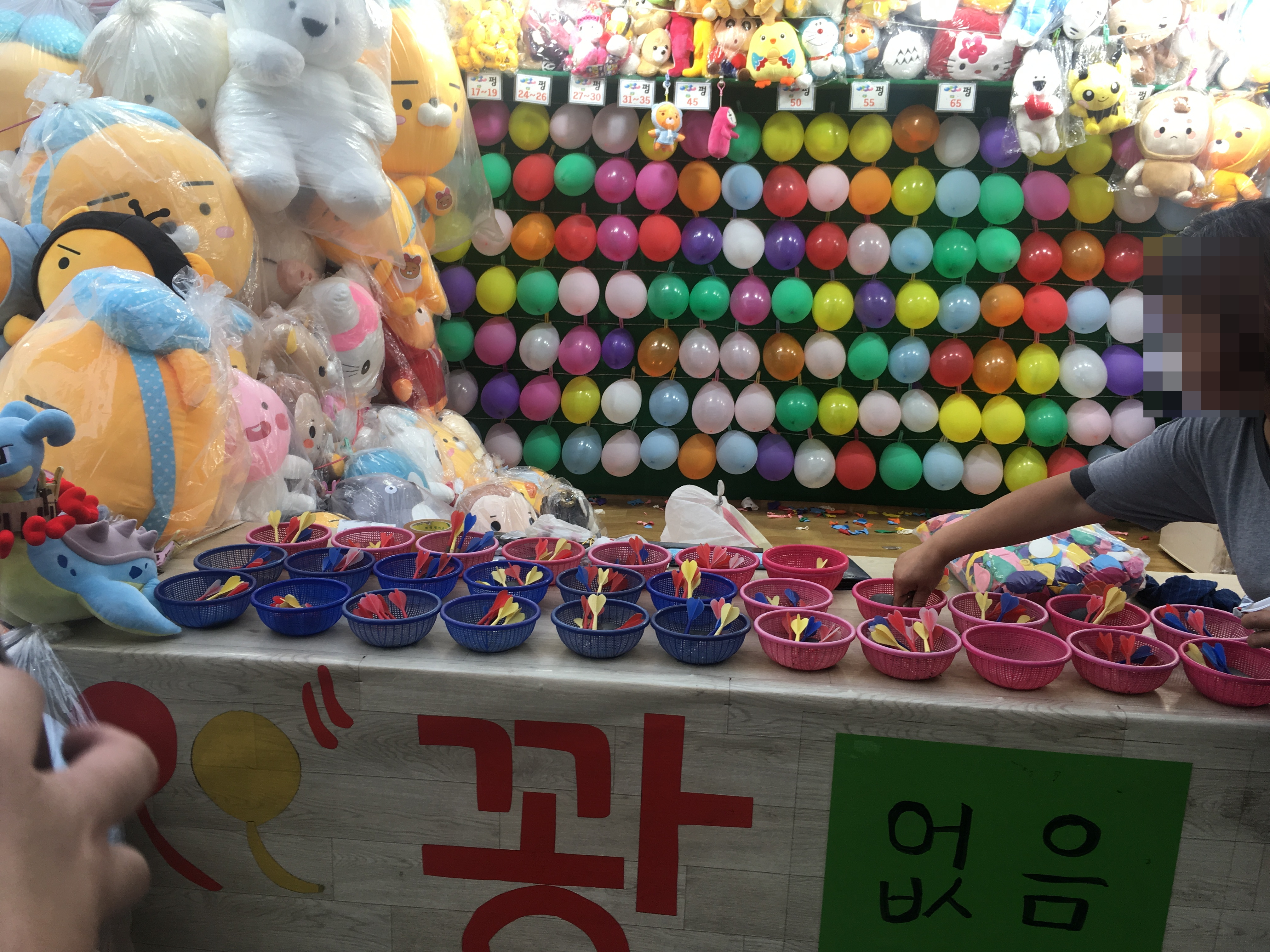 ปาลูกโป่งคงเป็นที่รู้จักกันดีในเมืองไทยตามเทศกาลต่างๆหรืองานวัดทั่วไป วันนี้มาลองปาลูกโป่งที่เกาหลีกันบ้างค่ะมีตุ๊กตาสวยๆน่ารักๆแถมตัวใหญ่อีกต่างหากจ้าาาา.....ในส่วนของราคา 3000 วอน 5 ดอก และ 10000 วอน 10 ดอก ค่ะ ถ้าคิดเป็นเงินไทย 3000 วอนก็ประมาณ 90 บาท และ 10000วอนก็ประมาณ 300 บาทไทยค่ะ และตุ๊กตาส่วนมากจะเเป็น Kakao friends ตัวการ์ตูนน่ารักๆจาก App kakao ที่เค้าฮิตกันในเกาหลีคร่าาา โดยส่วนตัวเป็นคนชอบปาลูกโป่งนะค่ะแต่ผิดที่ปาไม่แม่นแค่นั้นเองค่ะ5555+++
