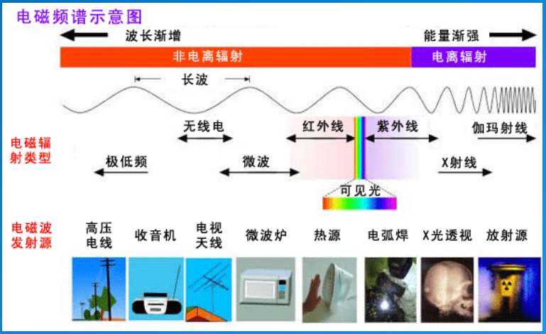 电磁辐射按照频率分类, 从低频率到高频率, 包括有无线电波、 微波、 红外线、 可见光、 紫外光、 X-射线和伽马射线等等。 人眼可接收到的电磁辐射,波长大约在380至780纳米之间, 称为可见光。可以根据功能对其进行分类,不同的波长对应着我们周围不同的电磁现象,频率很低的时候,波长相对比较长,对应的物体也是一个比较大的物体。随着频率的升高,我们周围的物体能够观测到的物体也越来越小。能够看到的东西也越来越精细。