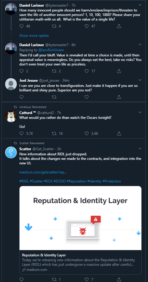 And don't forget that my blogs will also now include a sweep of my twitter feed and all the news from @dan larimer and other crypto twitter stars talking about all the great news like we have on scatter etc