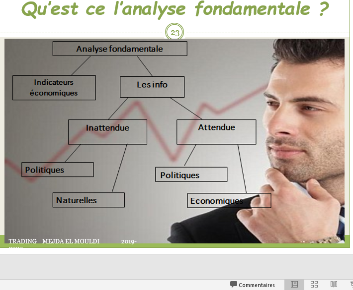 Analyse fondamentale – l’étude de changement du cours de devise sous l’influence de facteurs politiques, économiques et naturelles, dans le but de connaitre la tendance du marché.