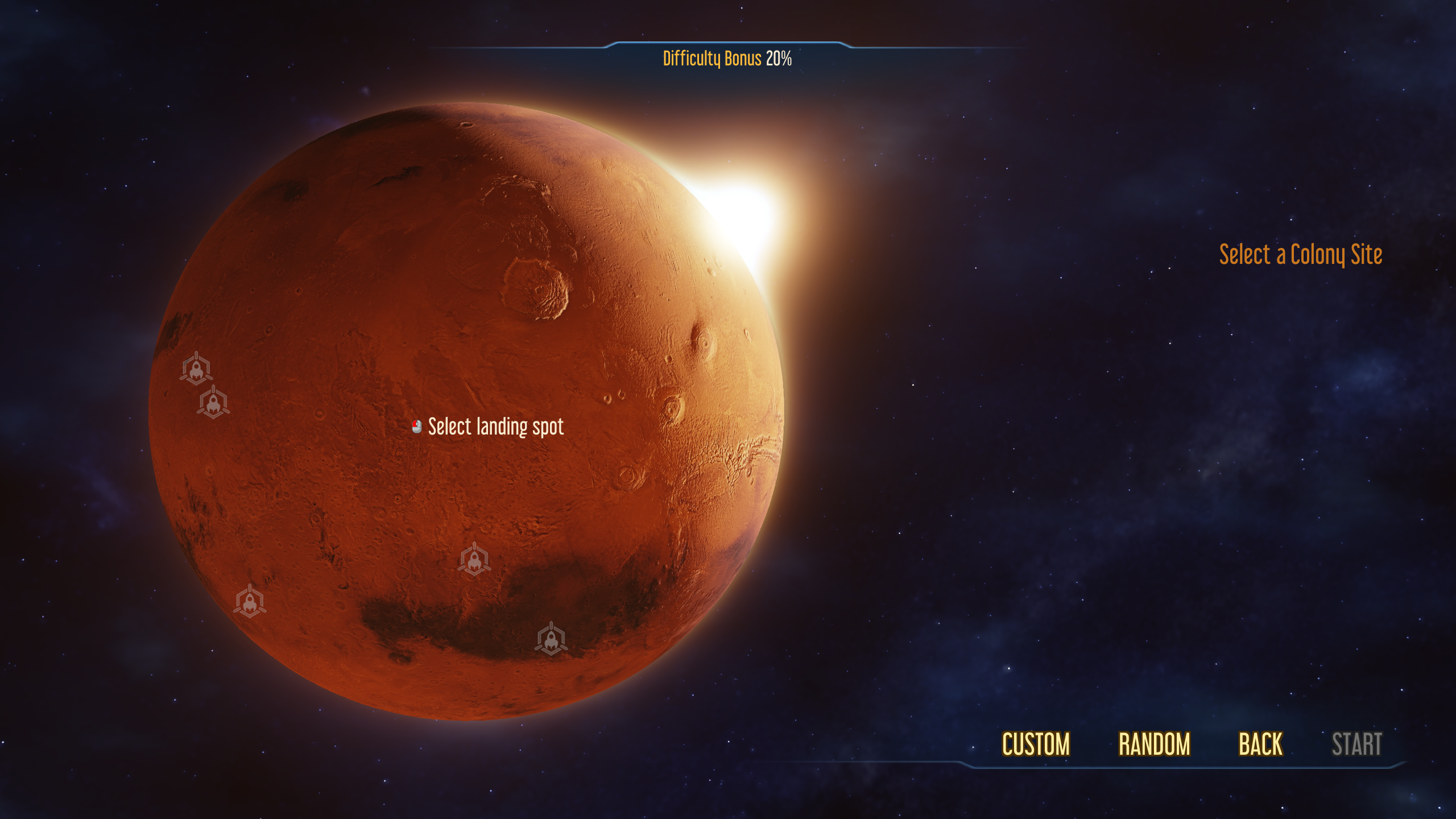 Finally, you must decide where on Mars you will settle. Some locations have greater resources. Others are more prone to disasters like dust storms, meteorite strikes and dust devils, which can damage your base. There are pre selected landing sites but you can land anywhere on Mars that you would like.