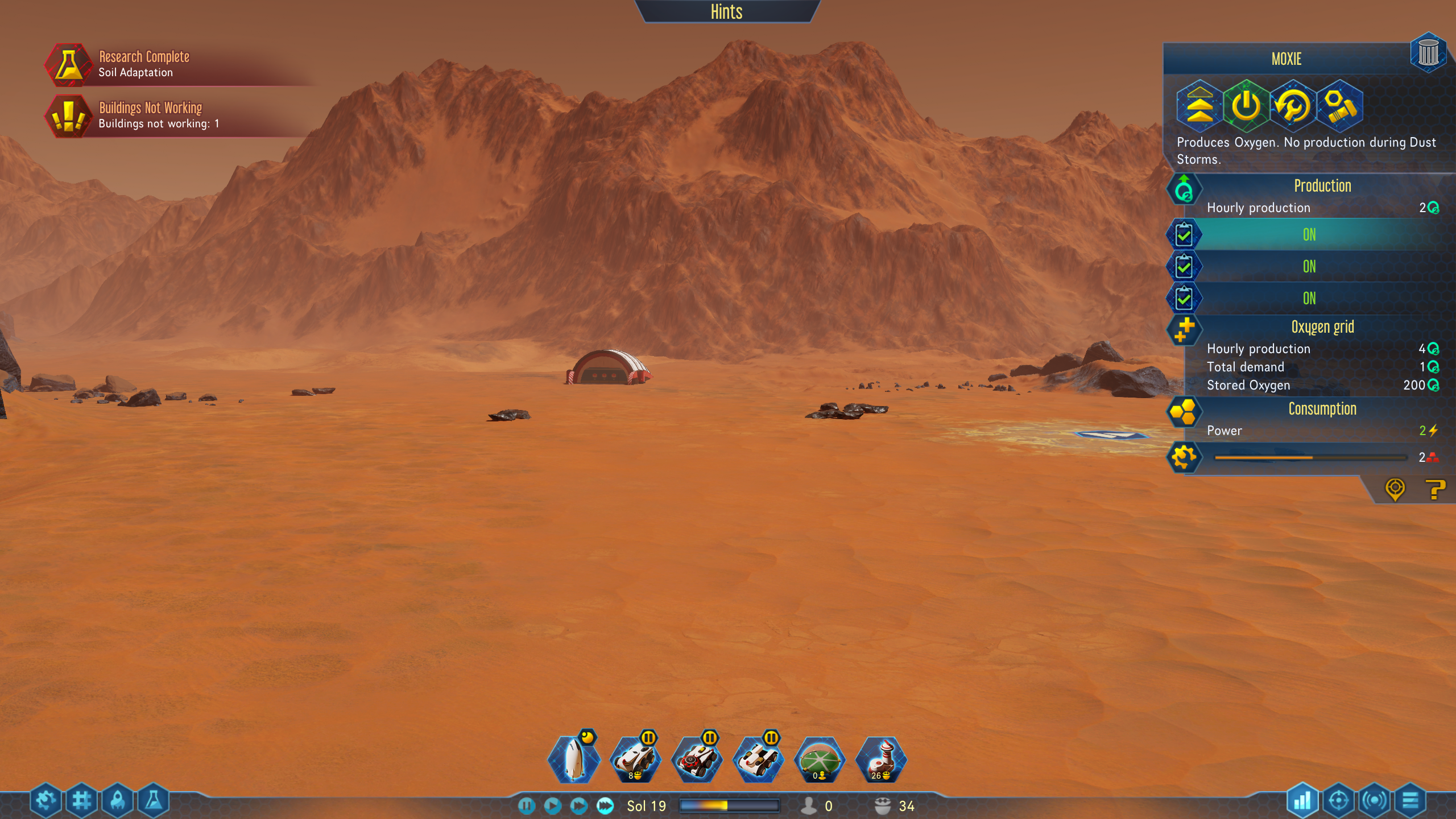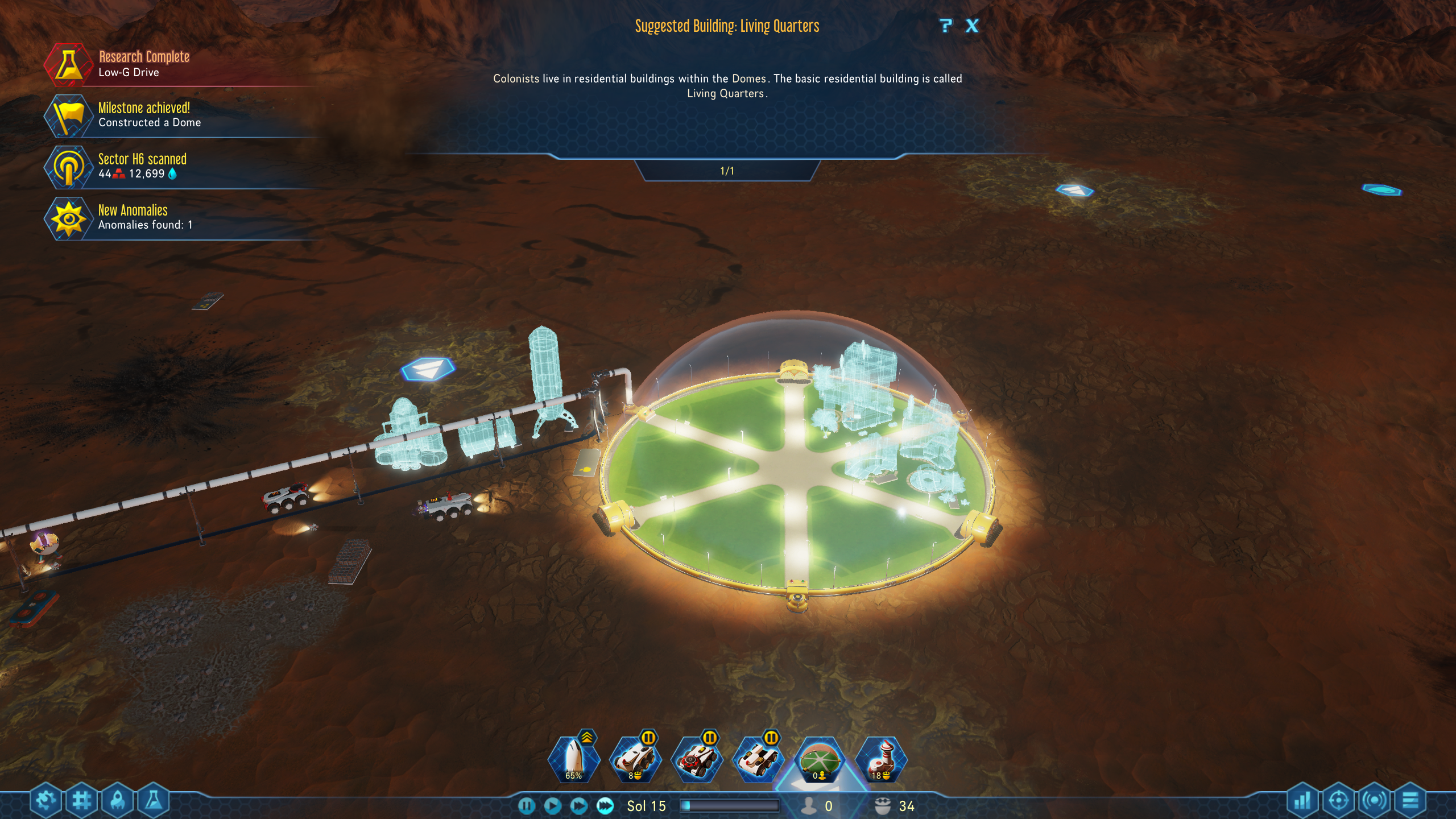 From here on out, it is a resources management game - making sure you have enough gathered, built, or sent from Earth in order to expand your base, build factories and keep up with demands for water and oxygen. Eventually you can mine rare metals to either use to build electronics or to earn money by exporting them back to Earth. You can build ever larger domes, populating them with more colonists, other building types and decorations. At times you will have random mysteries to discover, adding further depth to the game.