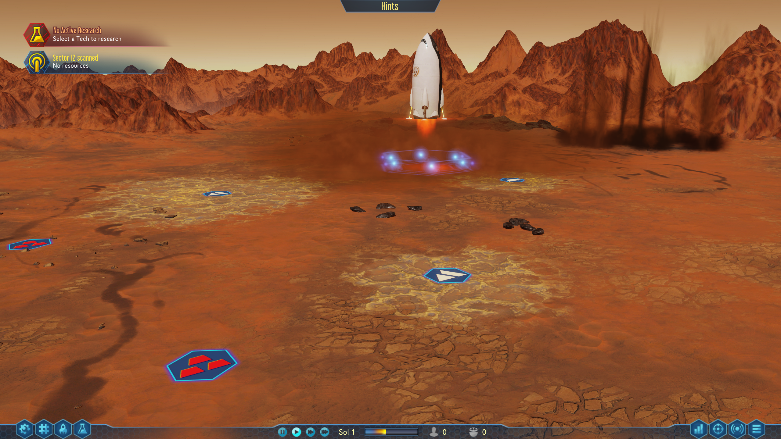 Finally, we arrive on Mars. You are presented with an overhead view of the map and you select where you want to land your first rocket. There will be one square selected for you with some resources, but if you use the orbital probe, you can scan for more suitable sites if you wish.