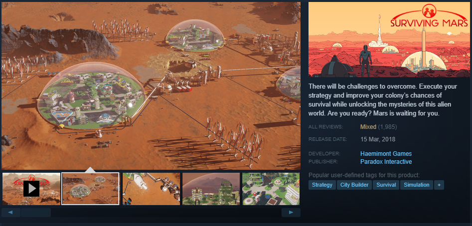 One of my favourites, which I have put some 477 hours into, is Cities Skylines. I was intrigued recently when the publisher, Paradox Interactive, announced a new game called Surviving Mars, created by Haemimont Games. Of course, with Paradox backing it, I was definitely interested. The game is another city builder of sorts, whereby you are given the task of setting up a permanent human colony on Mars.