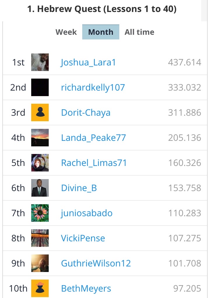 June Game Leadersholylanguage (54)in #game • 5 years ago (edited) Mazal tov to last month's Memrise game leaders! (And if you haven't started yet it's not too late, join the fun here https://holylanguage.com/memrise and let's see you on that leaderboard next month!) #fun #play #app #bible #hebrew #israel #language