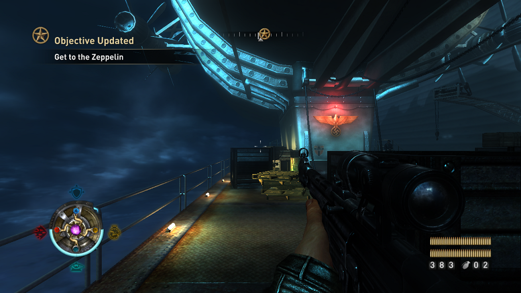 Deathshed kemudian merencanakan portal ke Black sun dengan menggunakan zeppelin agar tidak mudah disusupi Blazkowicz. Namun, kita berhasil melalui berbagai rintangan dan menyusup ke dalamnya. Ketika di dalam zeppelin kita mengetahui bahwa ketua dari Golden Dawn telah berkhianat dan menjual berbagai macam informasi kepada nazi demi keselamatan dirinya, namun justru mati di tangan Han-Grosse pada akhirnya. Pada akhir pertempuran kita tidak akan berhadapan dengan Deathshed, namun dengan Han-Grosse yang dilengkapi dengan machine gun di kedua tangannya dan Thule Medallion di armor tubuhnya di dalam Black sun. Pada pertempuran akhir kita akan menghadapi Han-Grosse empat kali, setiap menyelesaikan satu tahap kita akan menancapkan Nachtsonne ke tubuhnya. Ketika empat Nachtsonne berhasil ditancapkan maka Han-Grosse akan semakin lemah dan dapat kita tembak sampai mati. Blazkowicz kemudian membuat bom di alat portal di Black sun. Kita kemudian berpacu dengan waktu untuk melarikan diri dari zeppelin, begitu Blazkowics selamat zeppelin tersebut jatuh dan hancur. Pada akhir scene diperlihatkan bahwa Deathshed tidak mati namun berteriak marah karena rencananya telah gagal.
