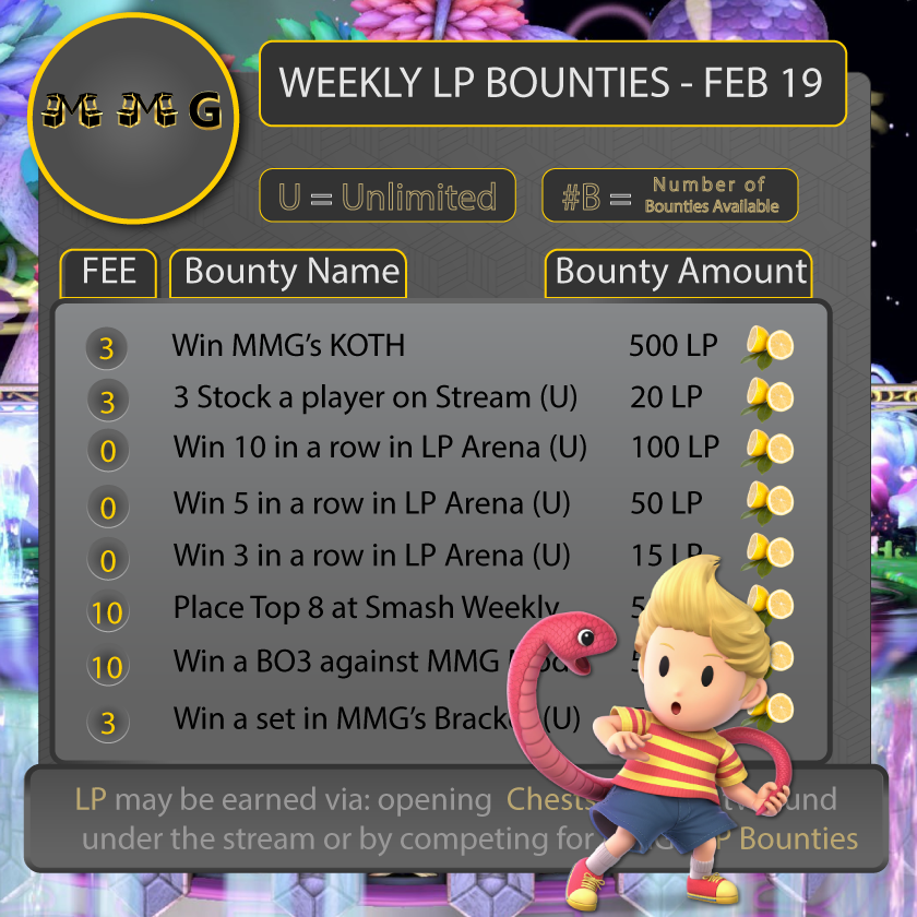 Bounties are available during All MMG Smash Ultimate events and Arenas. Specific Bounties are also available unrelated to MMG live streams or MMG in general.