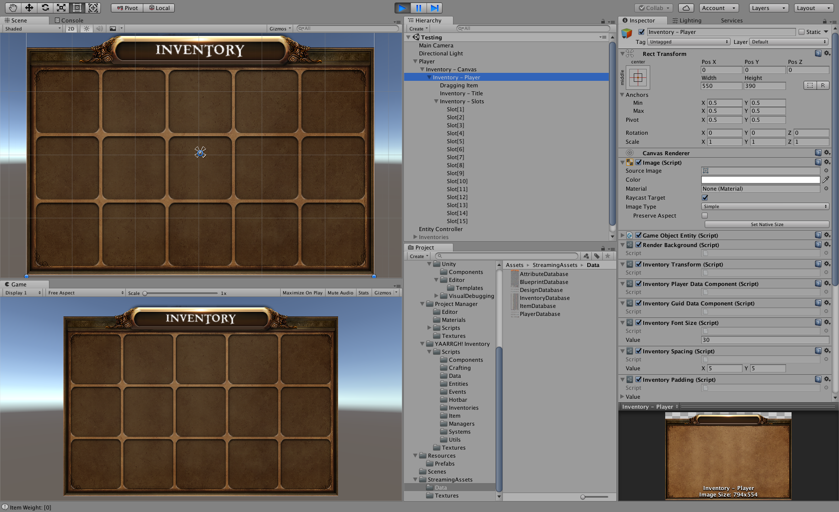 This is our first design draft of a game inventory system for YAARRGH! The next stages of the design draft will also include Crafting and Blueprints and the final stages will have random chest, player attributes and item spawning. This will be a boring technical documentation, show casing the technologies and design patterns for handling game data inside of YAARRGH!