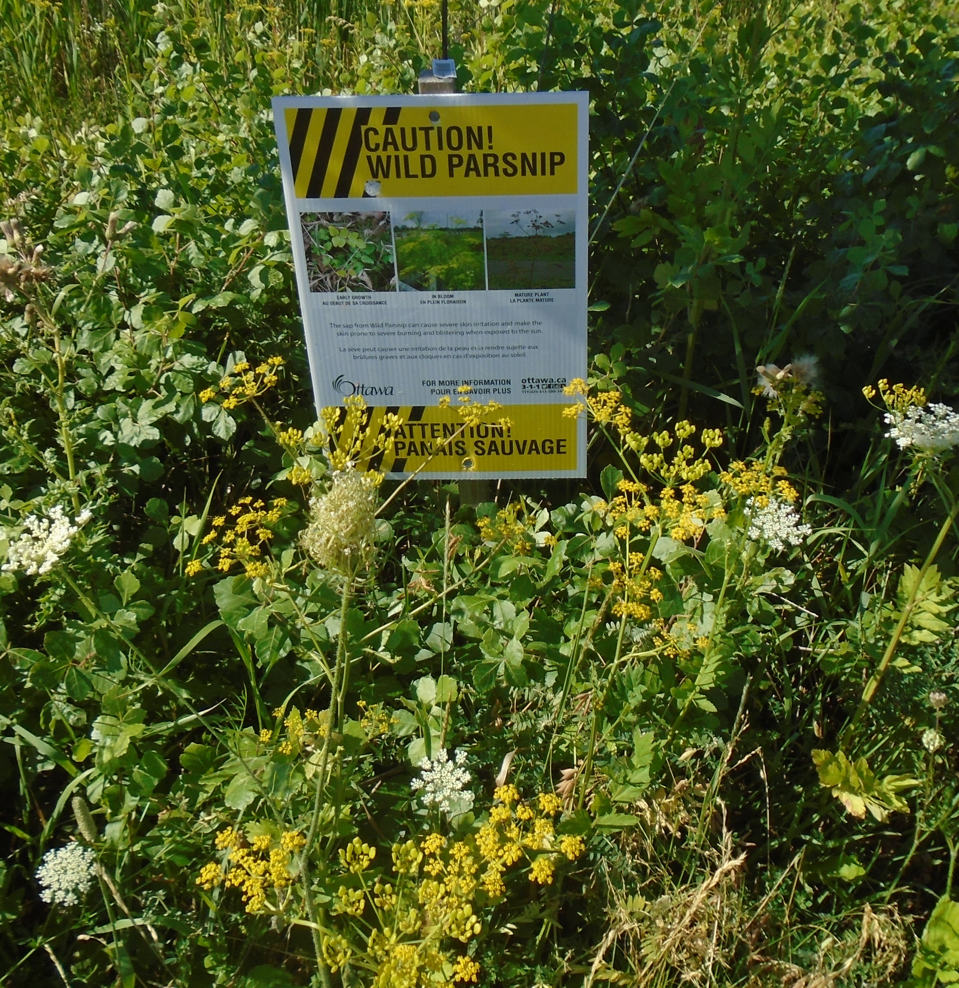 Wild parsnip grows abundantly along many of the ditches and also around the storm water pond which I like to visit. In the photo it is the plant with the umbrella like head with yellow flowers. It came to Canada with European settlers as a food plant for its starchy root. While the root is edible the stems of the plant contain a sap that can cause blisters, rash, and intense burns when exposed to the sun. Most of us know better than to meddle with it.