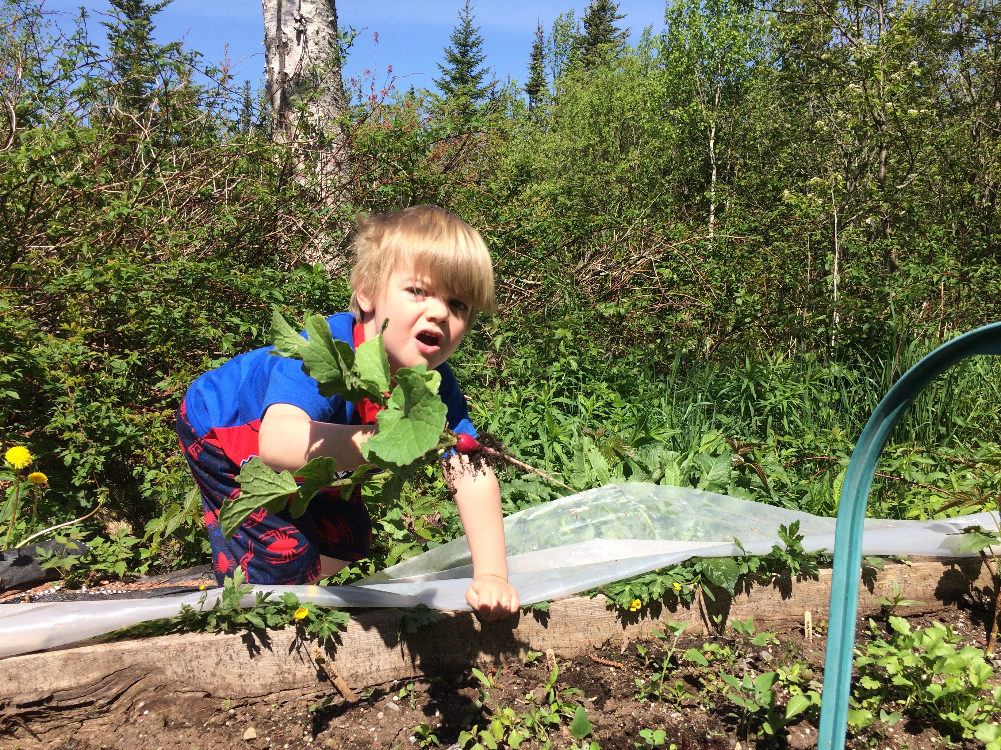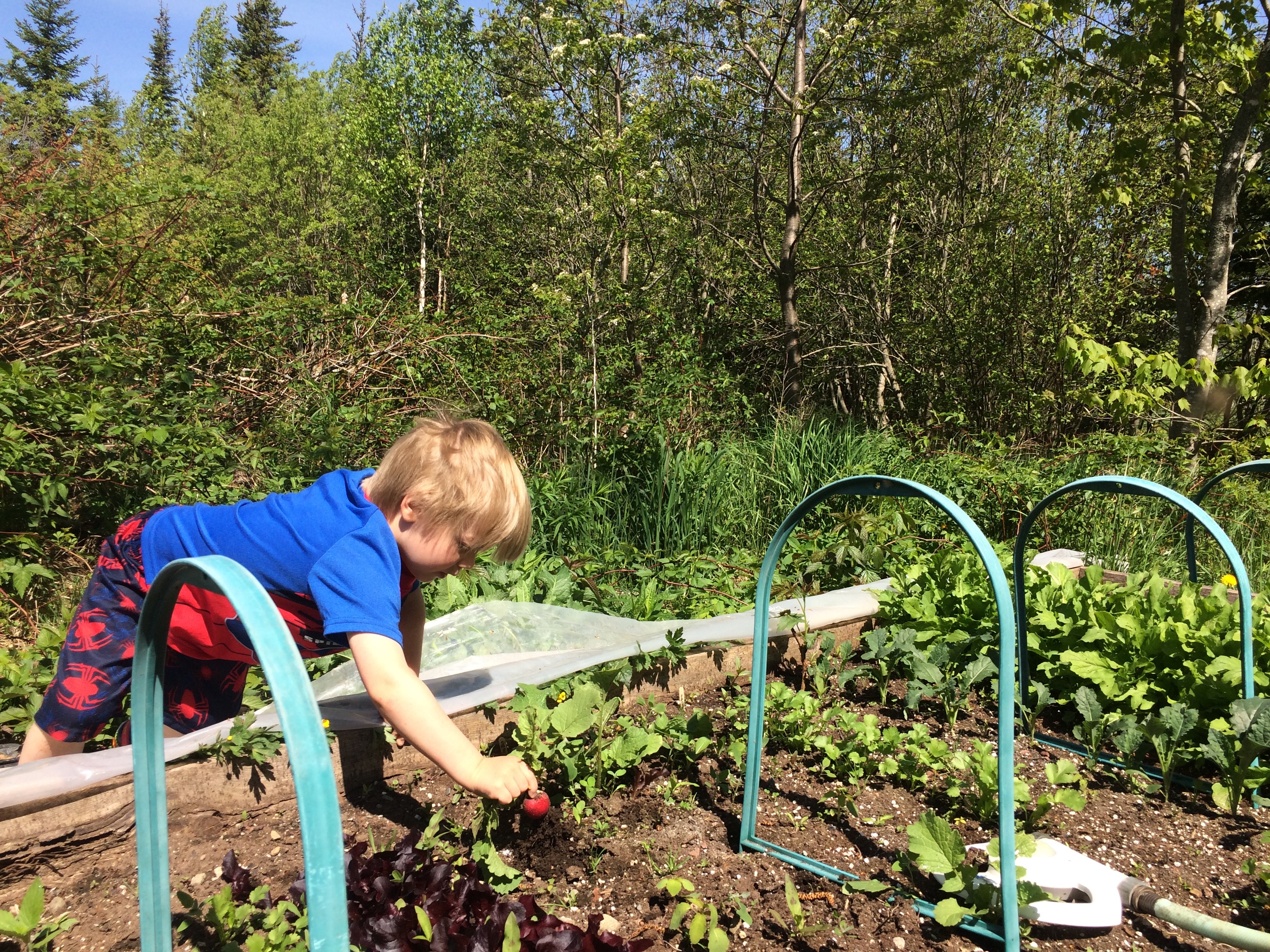 "This ones really small Daddy." A few days ago he was playing "mario brothers" and decided to pull the radish early, and his mom gave him a bit of a scolding, I think he was worried pulling a small one was going to equal a talking to. It must be hard to discern when its ok to pick and when it isn't at 4 yrs. He completely amazes me at his many milestones, he's broken all the ones I had in my mind, now I just sit back and watch half in fear!