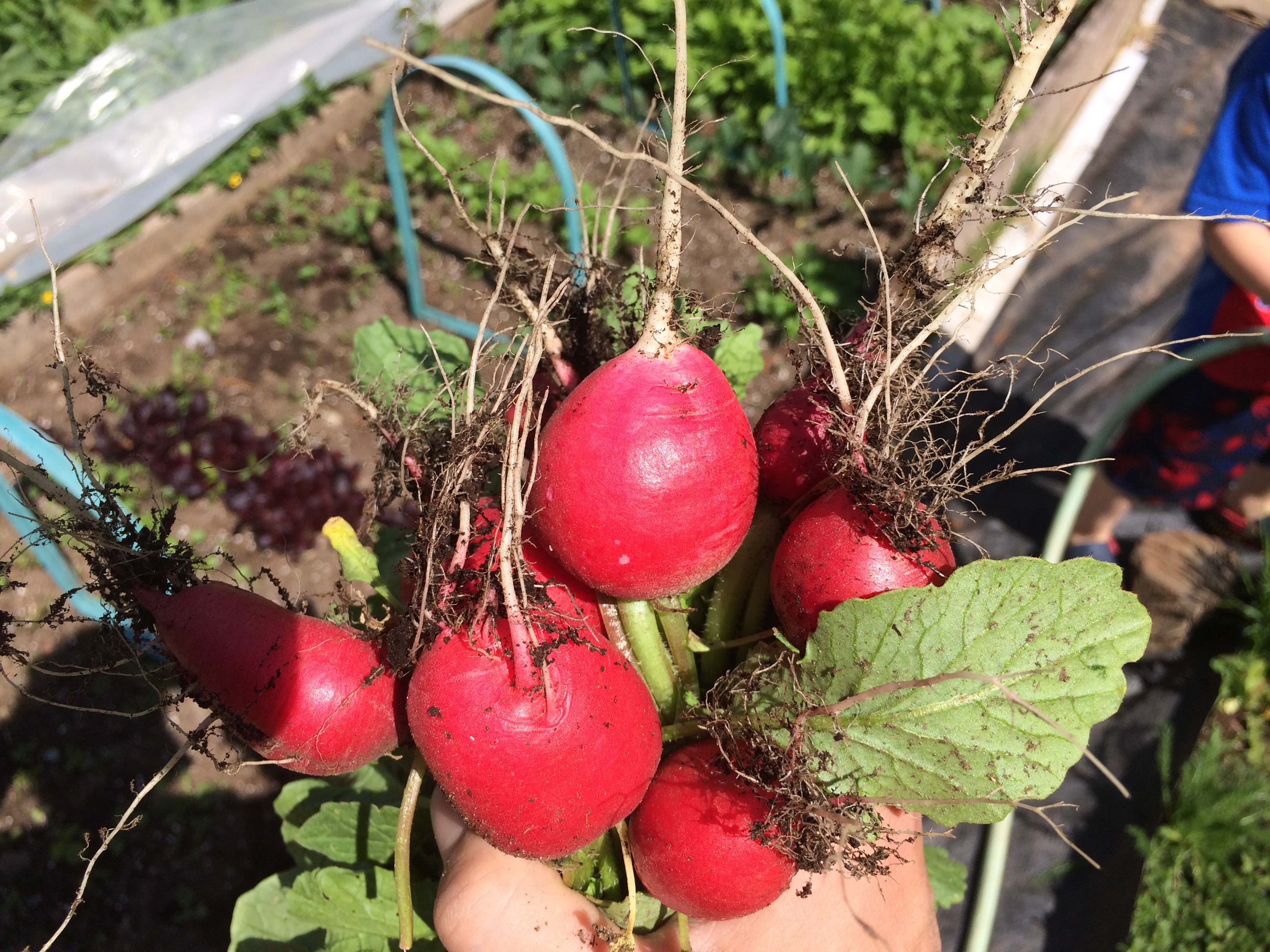 Hello and good day @mobios. I enjoyed looking at the beautiful photos of your nice garden. Your son seemed to like and love being in the garden with you. He'll appreciate you teaching the skills for tending a garden as well as understanding how to plant vegetables as he matures in age with your guidance. That was cute him harvesting the radishes and putting them in a blue hat or basket. Thanks for sharing this moment with yourself and your son to us. That was nice. Have a wonderful lovely day.