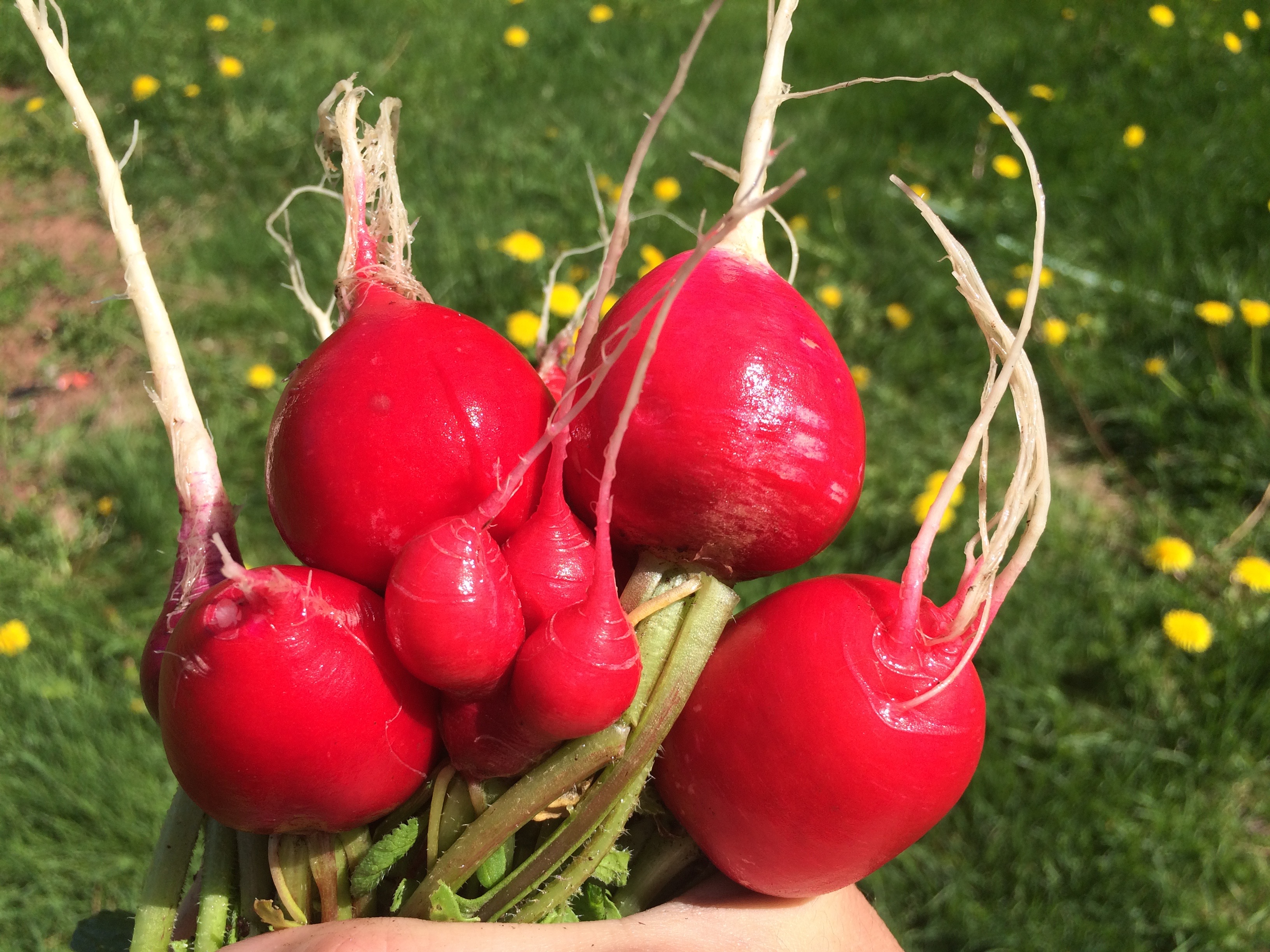 These are the best radish I've grown in a long time, so I had to do a little Steem photo shoot. They took on such a vibrant red, and they actually are more sweet then spicy even though they are large. When I plant, I sow the radish seed quite dense. A couple of weeks later you should thin. I would say I waited a little too long! Here it looks like 3 or 4 decided to fuse and make this mutant three legged radish.