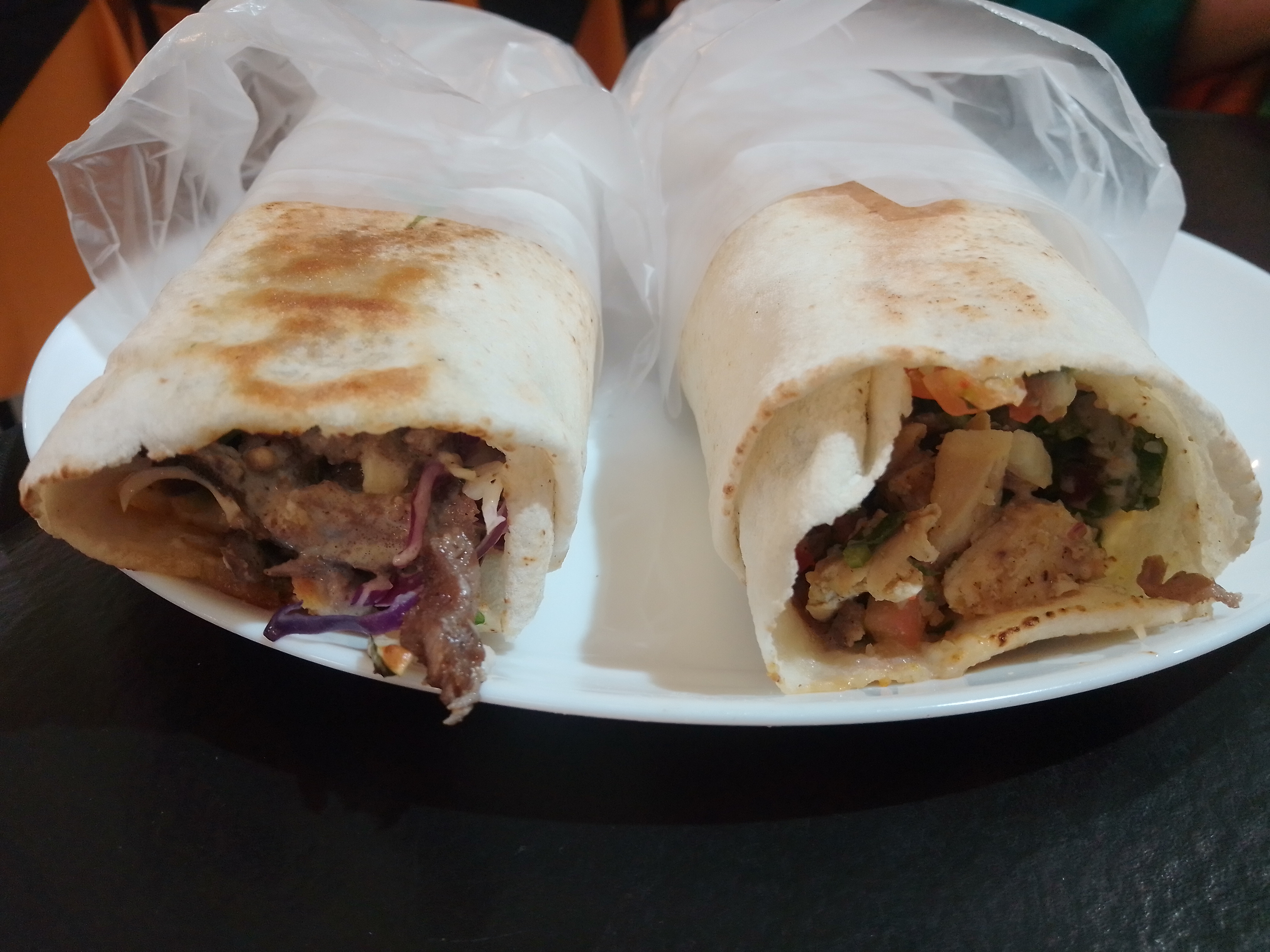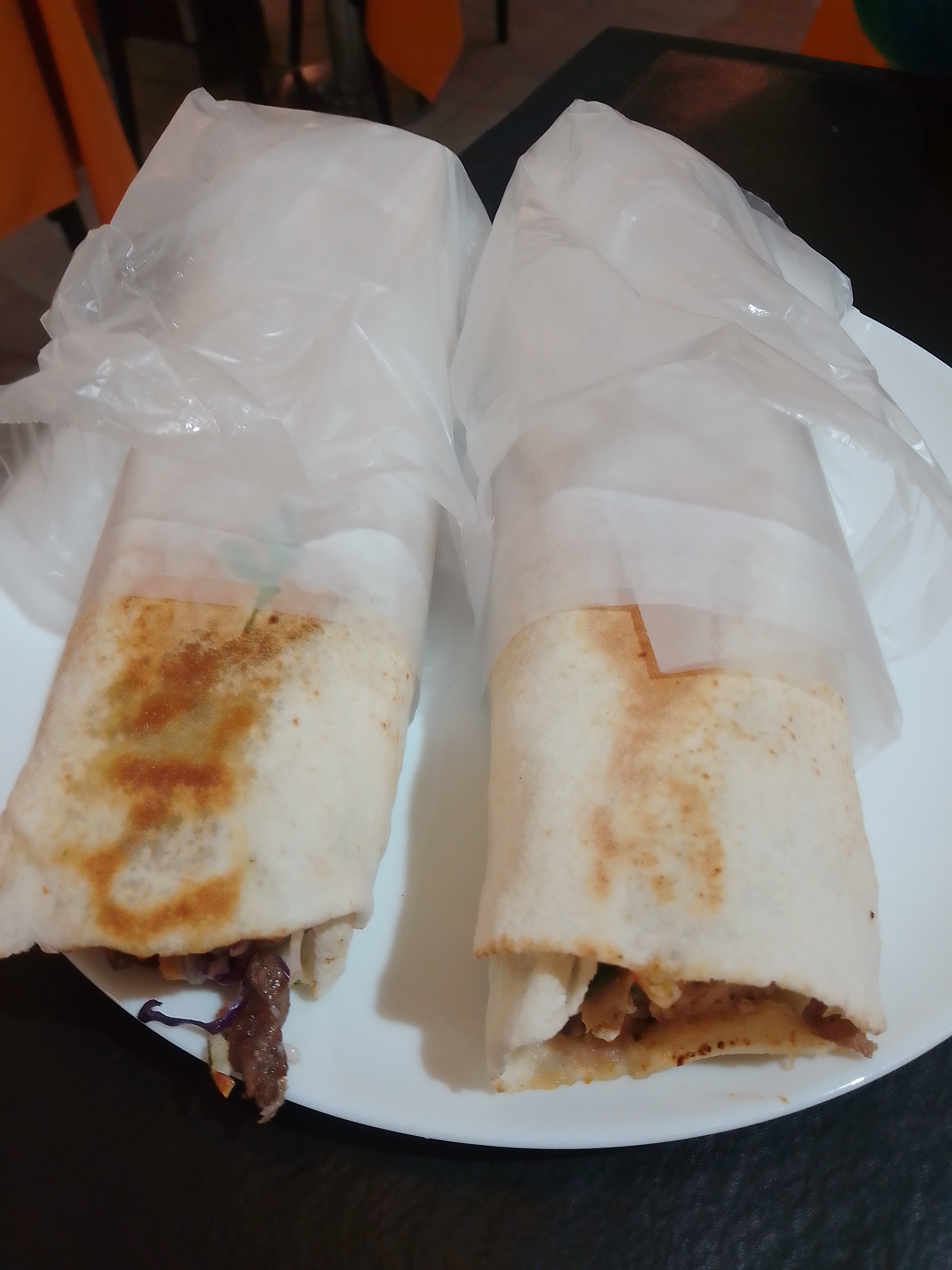 I ordered the first thing that caught my eye: shawarmas, the classics. When the plate arrived, I knew I’d made the right choice. In front of me, two shawarmas seemed to stare back as if competing for my attention. The one on the left, with its juicy meat peeking out between purple cabbage leaves and a creamy sauce that promised intensity; the one on the right, with golden chicken pieces, fresh tomato, and that perfume of spices that made me close my eyes the moment I caught it.