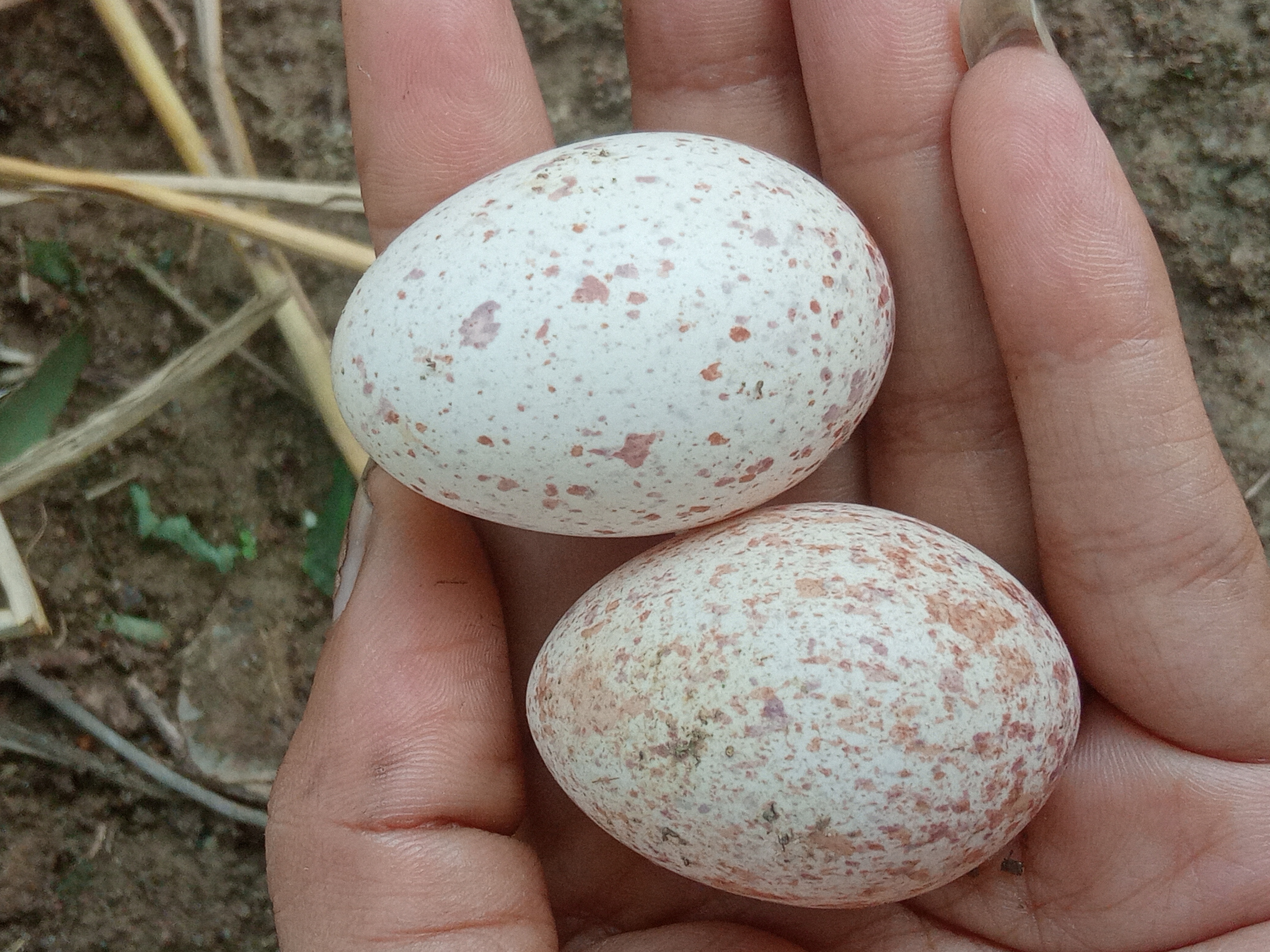 যাইহোক গতদিন প্রচুর পরিমানে ঝড়-বৃষ্টির কারণে মনে হয় ডাহুক পাখির বাসা ভেঙে গিয়েছে।আজ দুপুরে স্নান সেরে পূজা দেওয়ার জন্য ফুল তুলতে গিয়েই দেখি,কাঞ্চন ফুল গাছের নিচে ছড়িয়ে ছিটিয়ে পড়ে রয়েছে দুটি ডিম।আর পাখির বাসাখানা তছনছ করে দিয়েছে।তবে অবাক করার মতো বিষয় হলো,উপর থেকে মাটিতে পড়েও ডিম দুটি ভাঙে নি অক্ষত অবস্থায় রয়েছে।ডিম দুটি আবার মুরগির ডিমের থেকে অল্প একটু ছোট সাইজের।তবে ডিমের গায়ে মেরুন রঙের ফোঁটা ফোঁটা ডিজাইন রয়েছে।