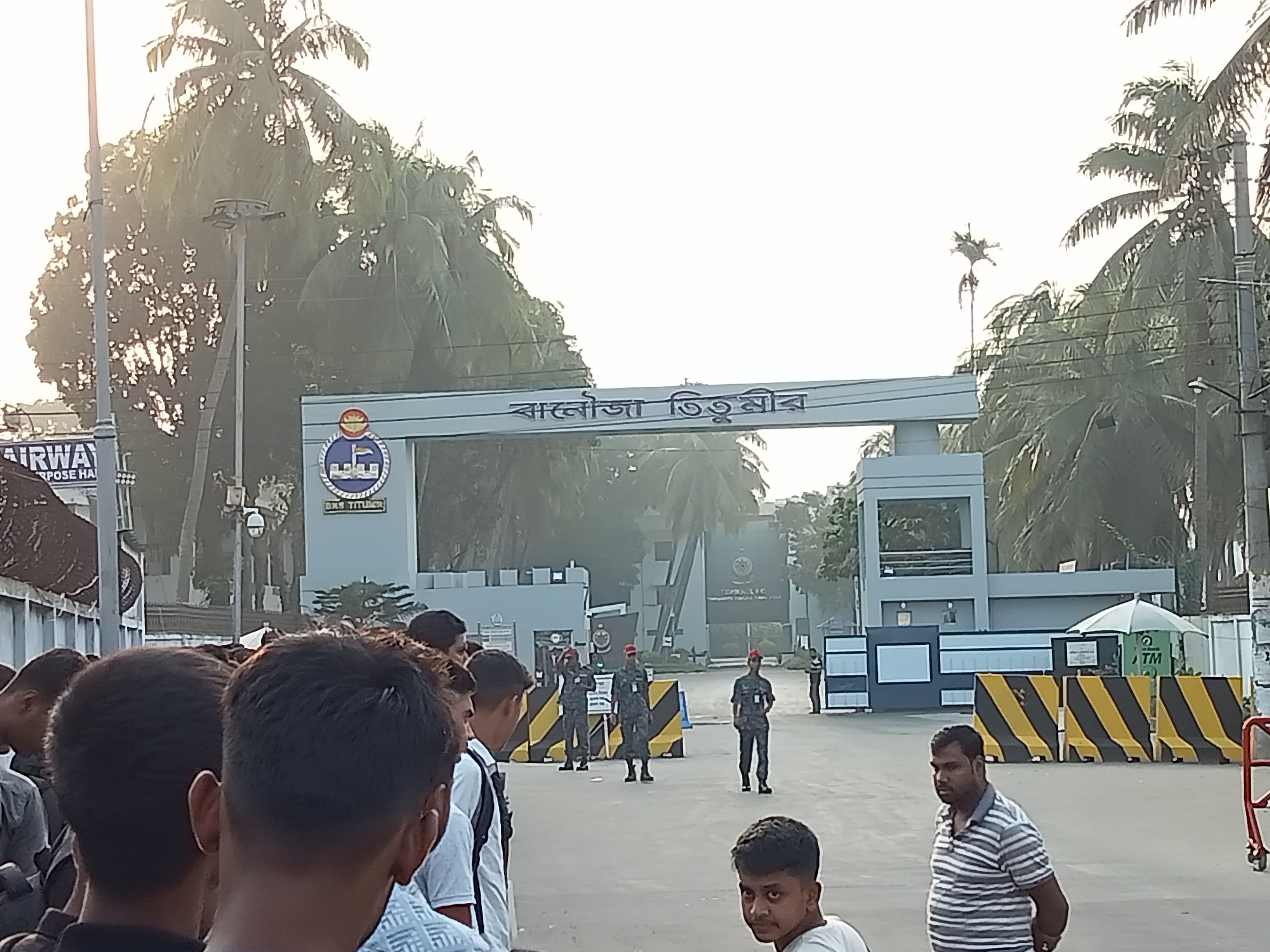 এবার আমরা আস্তে আস্তে গেটের সামনে আসি। সত্যিই যখন এখানে পৌঁছায় তখন মনের মধ্যে একটা অন্যরকম ভালো লাগে কাজ করেছিল। ভালোলাগা কাজ করে ছেলের জন্যই যে আমরা নির্দিষ্ট টাইম এর আগেই পৌঁছেছি। তাছাড়া আমার লাইফে এটা ছিল প্রথম মাঠ নৌবাহিনীর। যাই হোক গেটের সামনে এসে উপরের ছবি দুটি আমি খুব চুরি করে আমার ফোনে ধারণ করি। কেননা সেখানে ছবি তোলা বারণ আছে। উপরে আপনারা লক্ষ্য করলে দেখতে পাবেন গেটে লেখা আছে বানৌজা তিতুমীর। তবে আমরা গিয়ে দেখতে পেলাম আমাদের আগেই অনেকেই এখানে এসে উপস্থিত হয়েছে। এরপরে আমাদের সকলকে লাইনে দাঁড়ানো নির্দেশ দিল। আমরা সবাই লাইনে দাঁড়ালাম এরপরে একে একে মাঠে প্রবেশ করলাম। মাঠে প্রবেশ করার পূর্বেই আমাদের বলা হয়েছিল ফোনগুলো অফ করে ব্যাগের মধ্যে রেখে দিতে। কেন নাই ফোন যদি কারোর হাতে থাকে তাহলে আমাদের এক্সফেল করে দিবে। এভাবে আমাদের সকলকে সতর্ক করে দিলো। তবে বাকিগুলো আমার অভিজ্ঞতা আমি আর বলছি না।