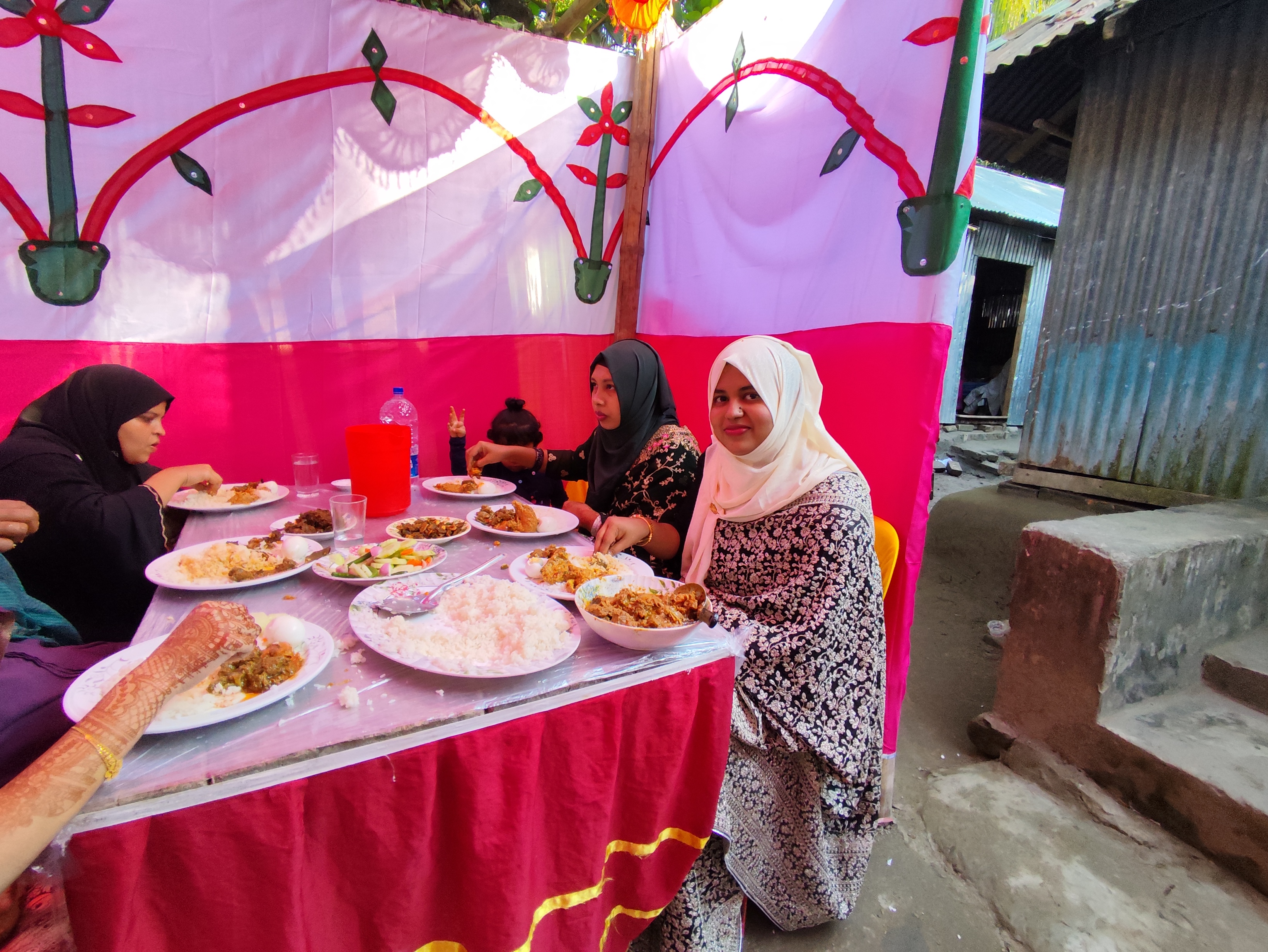 আর গাড়ি করে যখন আমরা যেতে লাগলাম রাস্তার সৌন্দর্য এবং প্রাকৃতিক সৌন্দর্য উপভোগ করলাম। প্রায় এক ঘন্টা যাওয়ার পর আমরা ছেলেদের বাড়িতে পৌঁছে গেলাম। তারপর আমরা আস্তে আস্তে বাগনীর হাসবেন্ডের ঘরে গেলাম। এবং সবাই ওইখানে কিছুক্ষণ বসলাম এবং ভাগ্নের সাথে কথা বললাম। আর বাগানের সাথে কথা বলে কিছুক্ষণ সবাই আমরা ঐখানে একত্রিত ছিলাম। এবং ভাগ্নির সাথে আমরা কিছু ফটো তুলে নিলাম। কিছুক্ষণ পরে বলতে লাগলো মহিলাদেরকে খাওয়া দাওয়া করাবে। তারপর আমরা সবাই খাওয়া-দাওয়া করতে প্যান্ডেলে গেলাম। তখন আমাদের ভাগ্নি কেউ সাথে নিয়ে গেলাম। যদিও আমার সাথে আমার বড় ভাগ্নেটি ছিল। আর আমার ননদের বড় মেয়ের সাথে আমার ভালো সম্পর্ক এবং দুইজন বান্ধবীর মতোই।