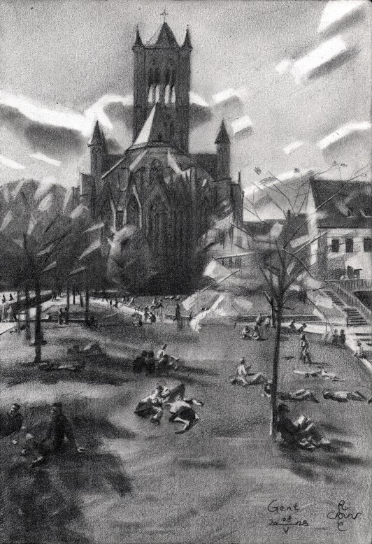 I had a vision of me sitting on the banks of the Leie. Taking a selfie with a beer and mussels for my parents. However, it proved to be too tall an order to execute. Restaurants at the Graslei were all full and mussels costed a staggering 28 euro. I settled for french fries stew from a famous Belgian ‘frietkot’ instead. Next thing was to take some pictures. There simply wasn’t enough space or a bench to sit on for sketching outdoors. I came across the Sint-Niklaaskerk (Saint Nicholas Church). At the back I had a nice view on the Emile Braun Square. Suddenly the sun came through the clouds. Plenty of leafy structures to capture. I had the same execution of drawing in mind as my last drawing of Berg en Dal. See how it would look applied to man made structures.