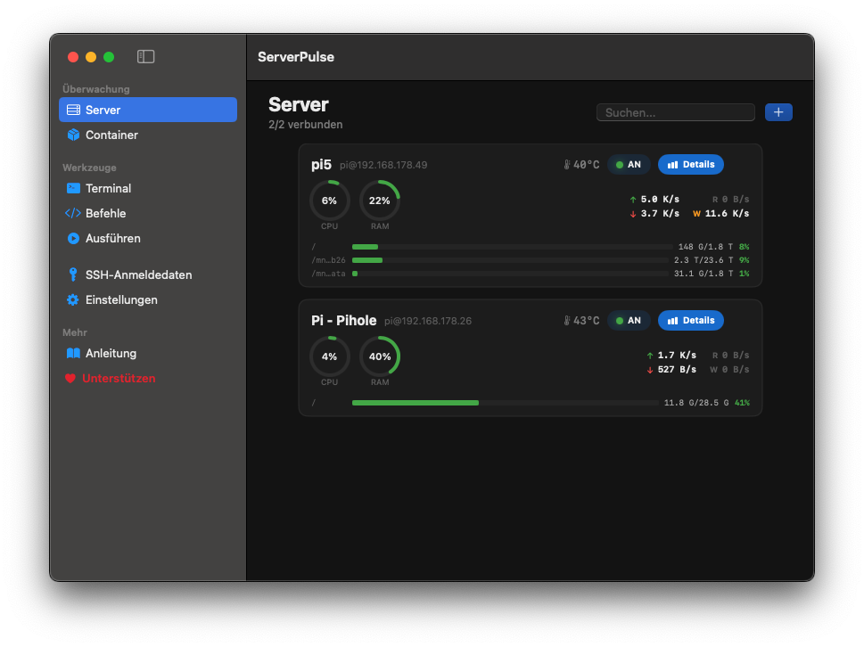 Ihr fügt einfach eure Server hinzu (Hostname, Benutzer, SSH-Key oder Passwort) und ServerPulse verbindet sich. Die App liest dann regelmäßig /proc/stat, /proc/meminfo, df und andere Linux-Quellen direkt über SSH aus. Kein Daemon, kein Prometheus, kein Installationsaufwand auf dem Server. Ich selber verwalte damit meine ganzen Pis.