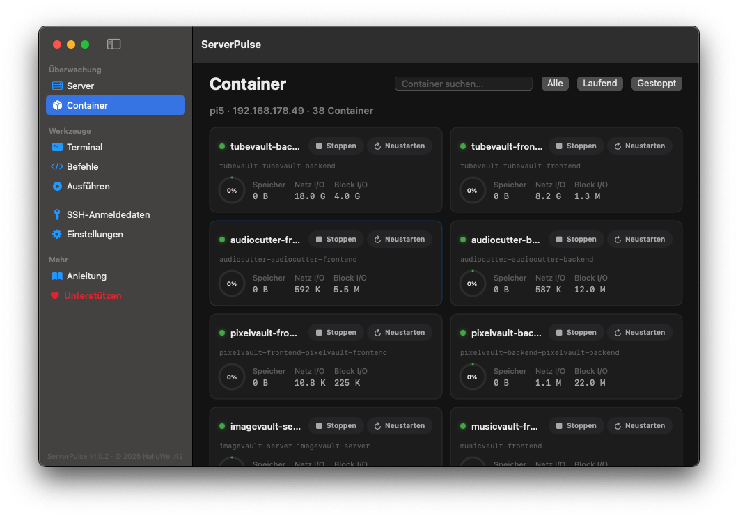 Wer Docker-Container auf seinen Servern laufen hat, kann diese direkt in ServerPulse sehen und steuern. Speicherverbrauch, Netzwerk, Block I/O, alles auf einen Blick. Stoppen und Neustarten geht mit einem Klick.