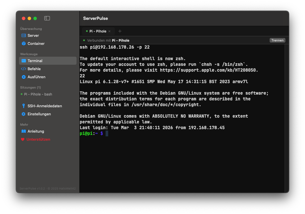 Manchmal muss man doch direkt auf die Kiste. Dafür hat ServerPulse ein vollwertiges SSH-Terminal eingebaut, mit Tabs, damit ihr mehrere Sessions parallel offen haben könnt. Kein Wechsel zu iTerm nötig.