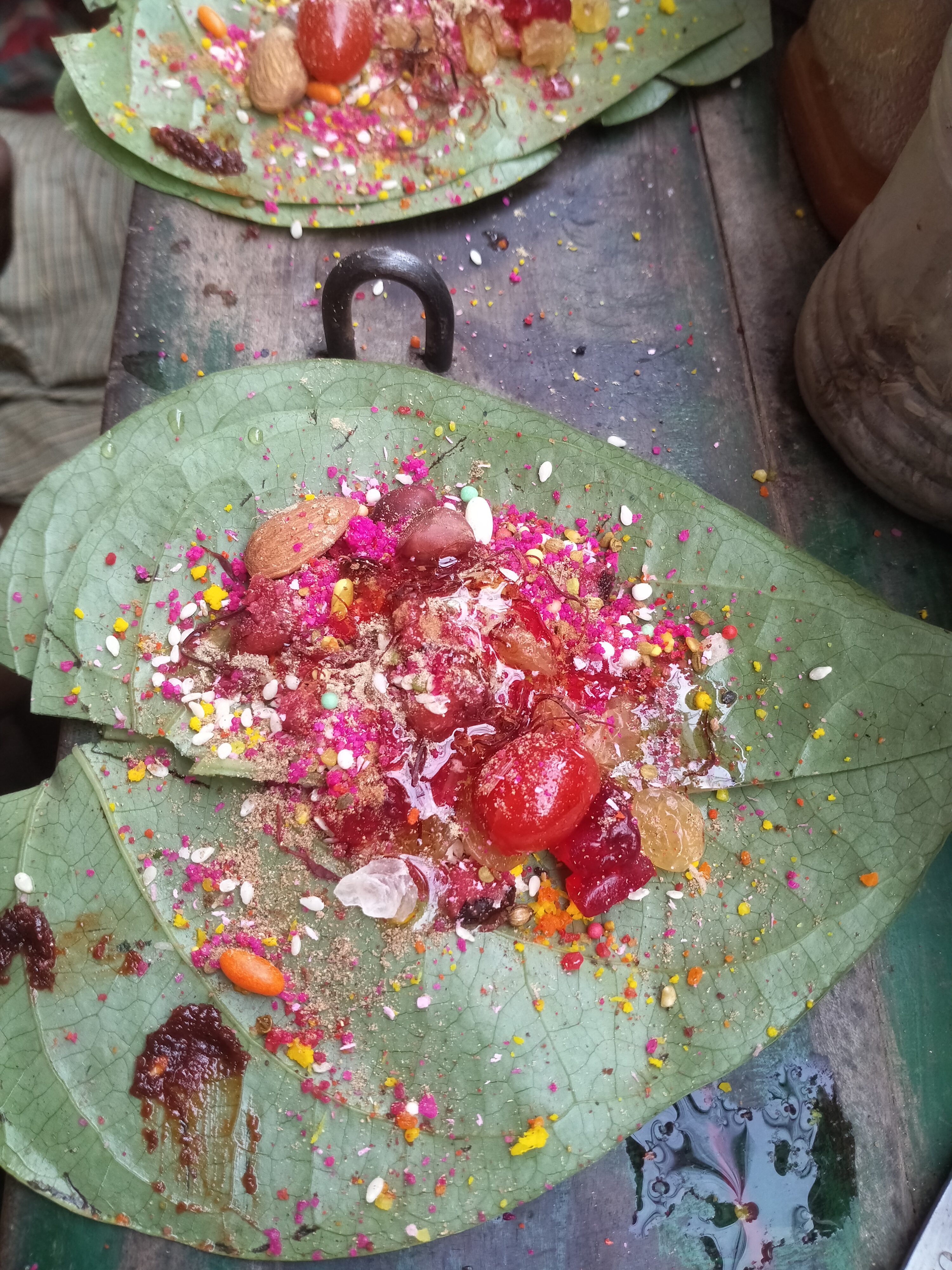 রেস্টুরেন্ট থেকে বেরিয়ে রাস্তা দিয়ে হাঁটছিলাম, এমন সময় হঠাৎ একটা মিষ্টি পানের দোকান দেখে আমার ভীষণ লোভ লেগে গেল। দোকানদারকে বললাম দুটো স্পেশাল মিষ্টি পান দিতে। এরপরেই একটা অবাক করা কান্ড ঘটে গেল। প্রথমে উনি আমাদের বলেছিল কিরকম ধরনের পান দেব। রাবিব বলেছিল আপনার বানানো সব থেকে বেস্ট পান টা আমরা খেতে চাই। এত এত ধরনের মসলা যোগ করছিল বলে বোঝাতে পারবো না। আমি অবশ্য শুরুতে এই ছবিটা তুলেছিলাম। অবশেষে এক পর্যায়ে গিয়ে বারণ করলাম যে , আর বেশি কিছু দিলে মুখেই ঢোকাতে পারবো না। যা আছে তাই দিন। পানের সাইজ এত বড় হয়ে গিয়েছিল যে রাবিব পান টা হাতে নিয়ে বার্গারের মত কামড় দিয়ে খাচ্ছিল। আর দাম দিতে গিয়ে আমার মাথায় হাত। বলে দুটো পান ৩০০ টাকা! 🙄🙄 আমি যেন আকাশ থেকে পড়লাম। সত্যি বলতে তিনশ টাকা পানের বিল দিতে যা কষ্ট হয়েছে, হাজার টাকা রেস্টুরেন্টে খরচ করলেও হয়তো এমন লাগতো নাহ্। হিহিহিহি।