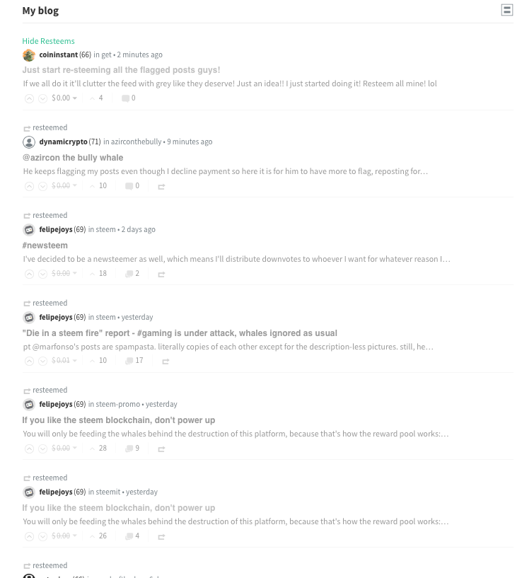 Just start re-steeming all the flagged posts guys!coininstant (66)in #get • 6 years ago (edited)If we all do it it'll clutter the feed with grey like they deserve! Just an idea!! I just started doing it! Resteem all mine! lol Like this, view screenshot below: #em