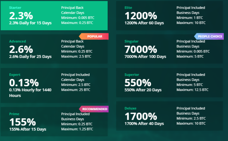 Ich kann nicht sagen, dass ich enorme Erfahrung bei der Investition in solche Projekte habe, aber die Erfahrung hilft, zwischen eintägigen Projekten und langfristigen Projekten zu unterscheiden. Hier denke ich, dass Sie zu niedrigen Preisen beginnen können, gehe ich auf Starter, wo ich täglich erhalten +2.3% der Anzahlung und am Ende der 15 Tage, um den ganzen Körper zu entfernen, erinnere mich, dass in diesem tarif erlaubt Kaution von 0.005 BTC zu 0.25 BTC, mehr setzen wird nicht im Rahmen dieses Tarifs.
