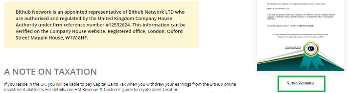 Auch in diesem Abschnitt, wo sich die rechtlichen Daten dieser Firma befinden, gibt es eine Schaltfläche "Check Company", indem Sie dort klicken, können Sie erneut die Ernsthaftigkeit Ihrer Aktivitäten überprüfen