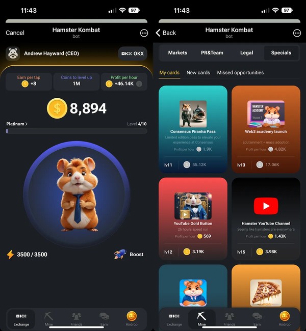 Hamster Kombat is a tap-to-earn game that has gained popularity on the Telegram platform. In the game, players earn coins by tapping, which can then be used to upgrade their virtual cryptocurrency exchanges. The game features various levels and cards that players can improve to increase their passive income. Players can also earn bonuses and boosts by logging in daily, completing tasks, and participating in referral programs (Hamster Combat) (KuCoin).
