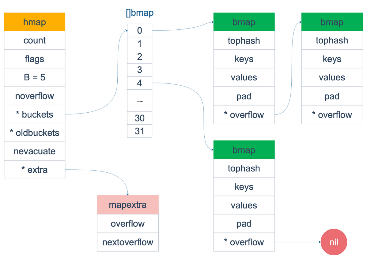 为了避免这个问题,需要有个地方能够直接引用这些溢出桶,也就是hmap 的extra字段,该字段为mapextra类型。