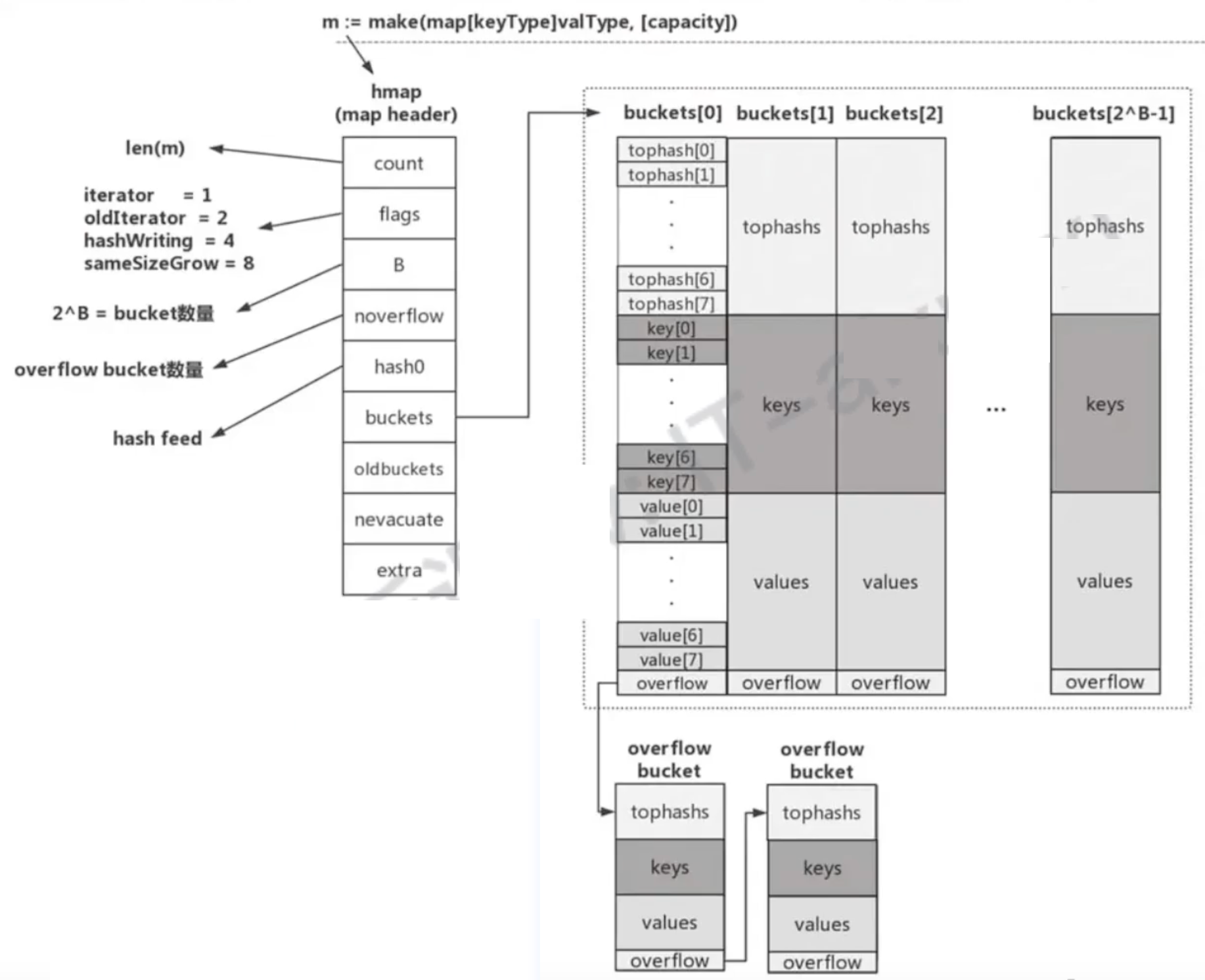 overflow *[]*bmap. // 指向所有的溢出桶,只用于 key 和 value 中不含指针的场景