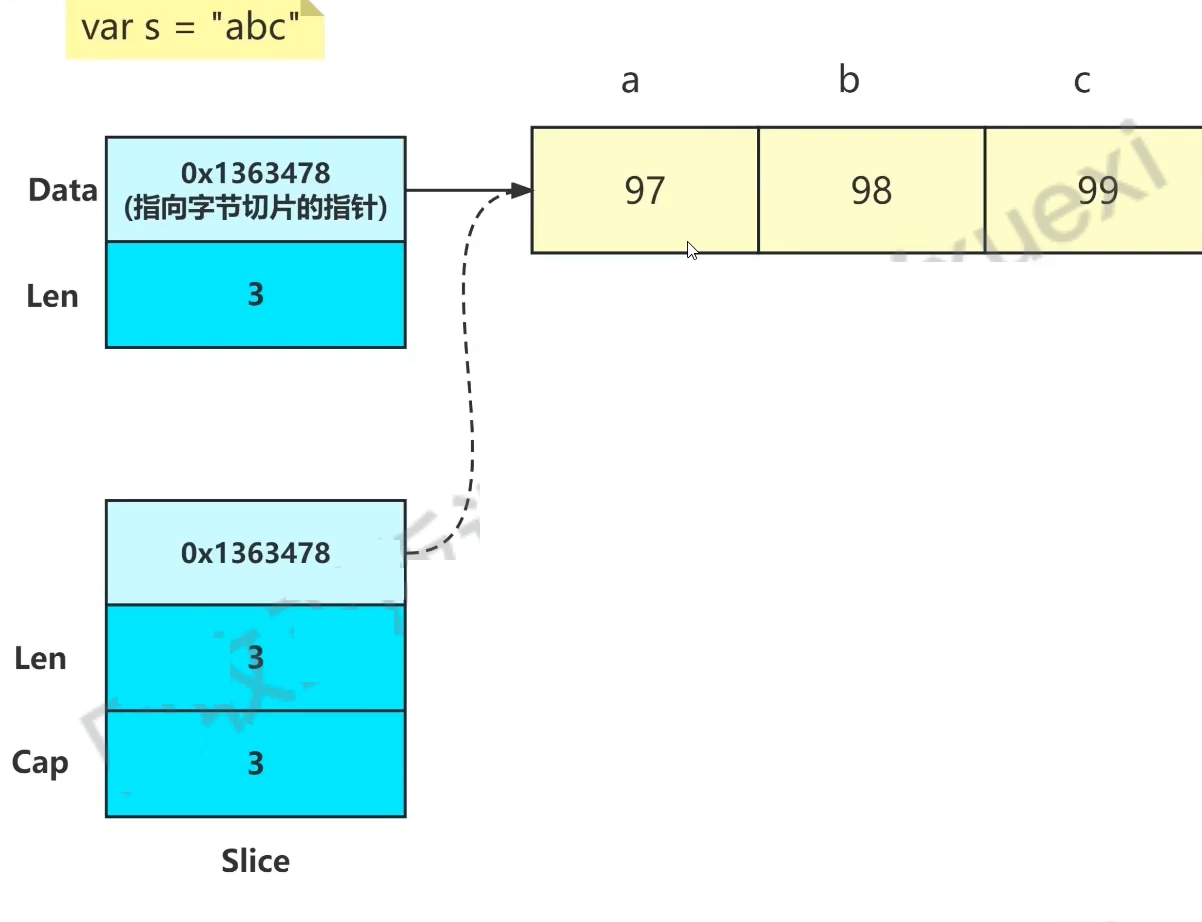 对字符串进行截取时,指向了同一个块内存空间。(slice切片截取后,底层数据还是引用原有的数据对象)