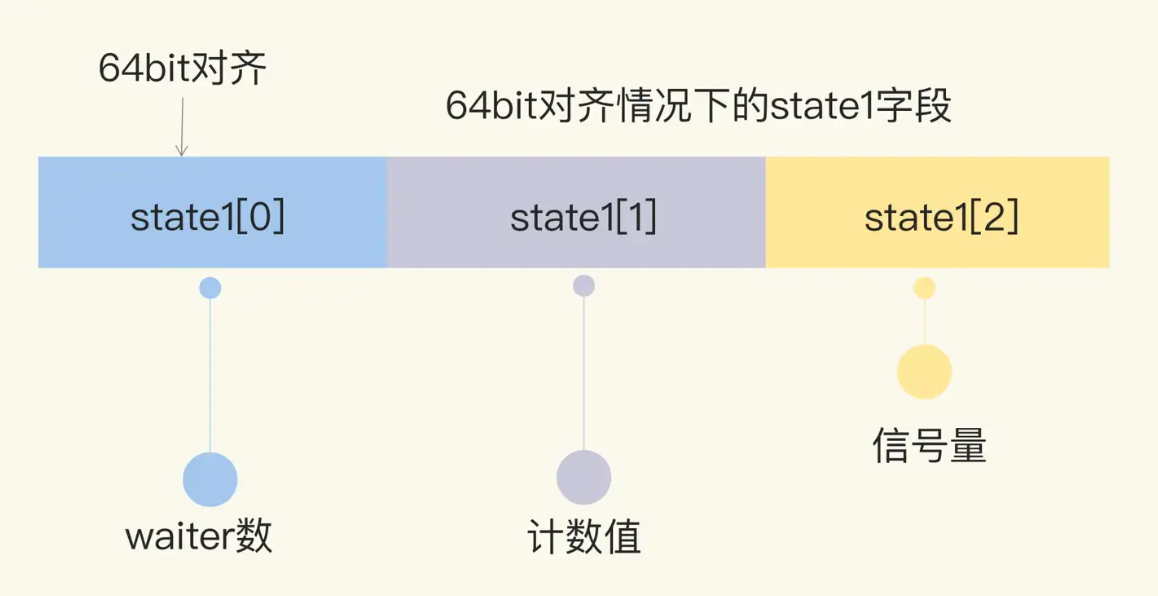 state atomic.Uint64 // high 32 bits are counter, low 32 bits are waiter count.