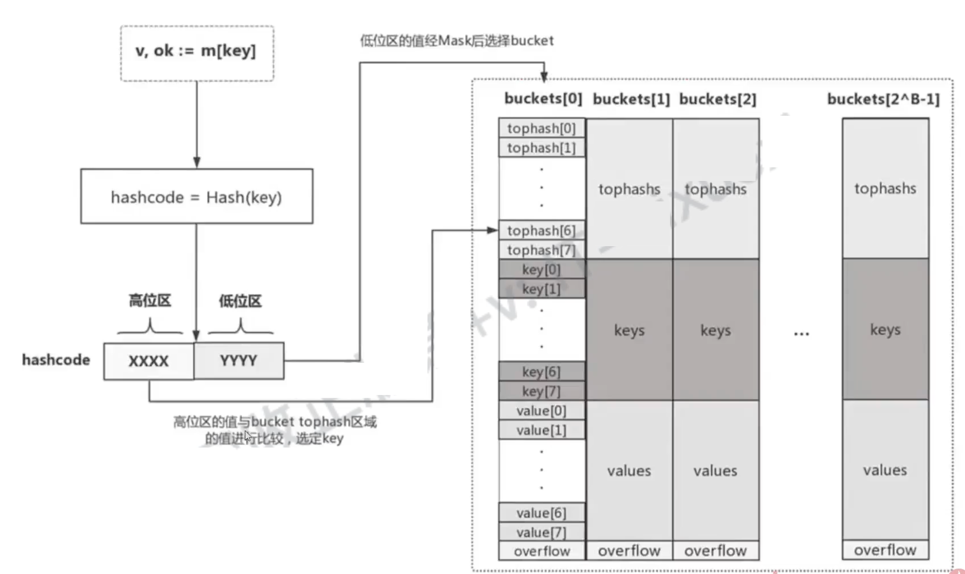 golang 将key的哈希值分成低位和高位两部分,低位哈希值用于确定 key 所在的桶序号,高位哈希值用于初步确定key是否在桶中。map 中已存在的 key 的高位哈希会被保存在bmap 的tophash中,除此以外,tophash 还可以用于保存一些标记。