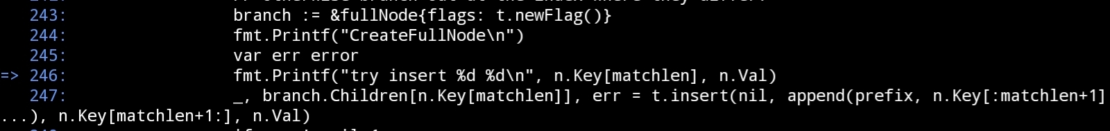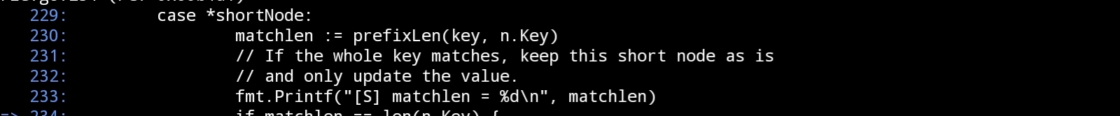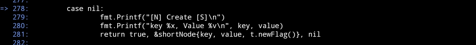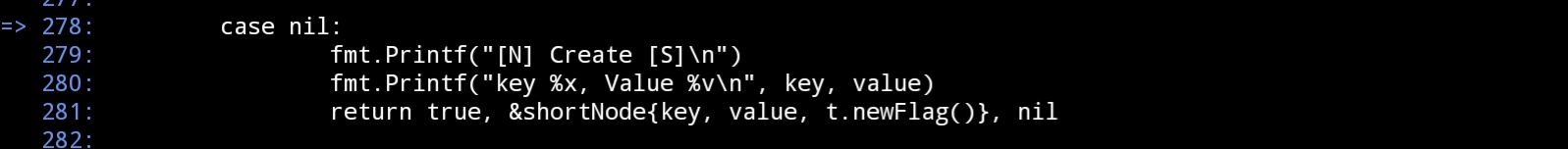 Breakpoint 1 at 0x60ac5b for github.com/ethereum/go-ethereum/trie.(*Trie).insert() /home/naksir/go/src/github.com/ethereum/go-ethereum/trie/trie.go:220 (1) - c로 break point까지 실행