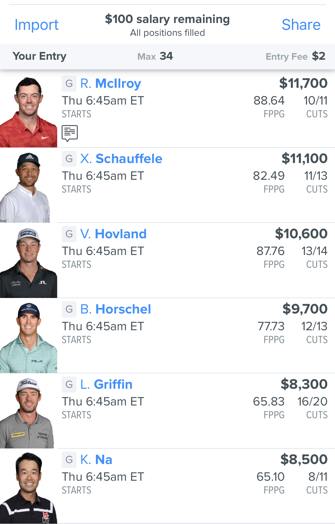 I am adding to the fun by playing a FanDuel fantasy golf competition, and here are my players: