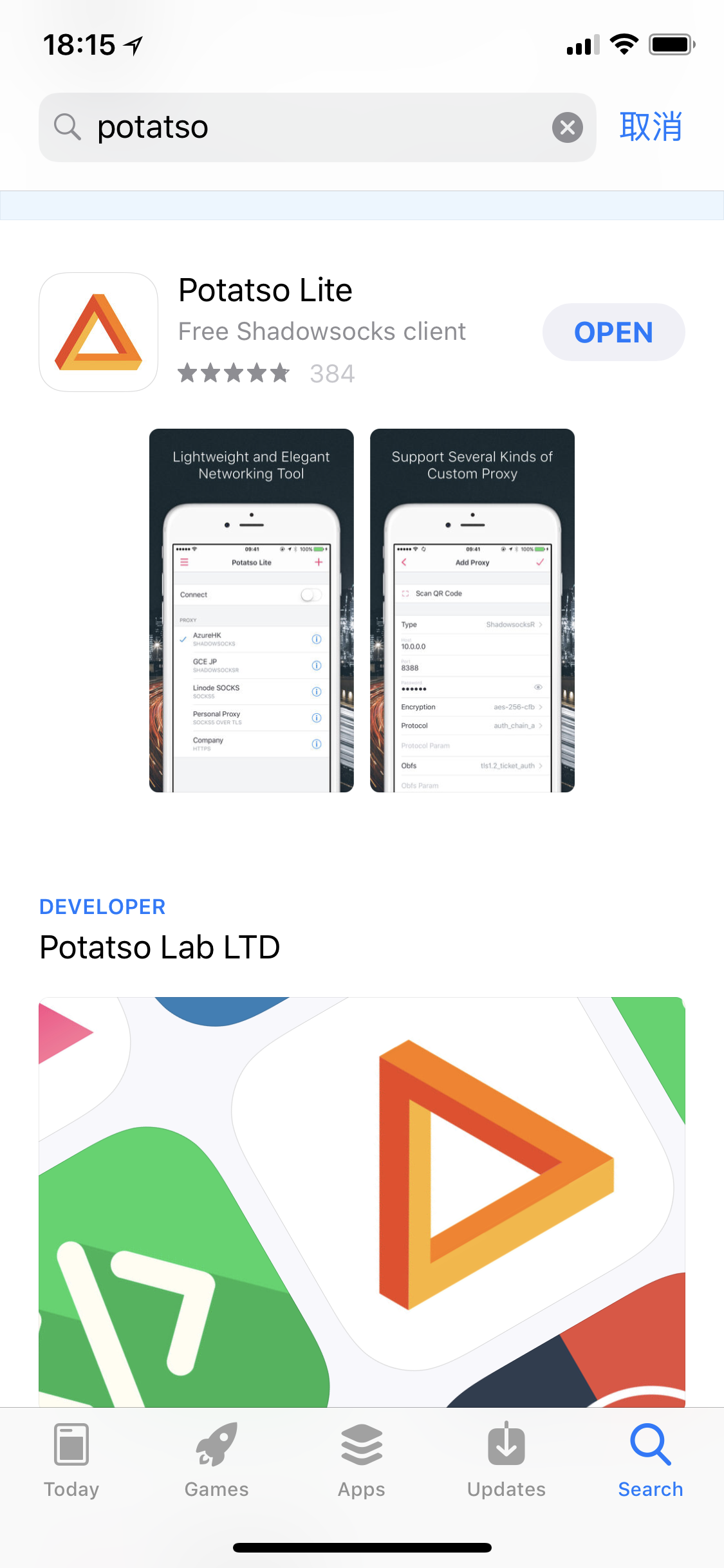 在iPhone上设置也需要下载软件,我用的是Potatso Lite,自己去App Store搜下(现在中国区的已经下架了,需要大家找个美区或者其他区的帐号)