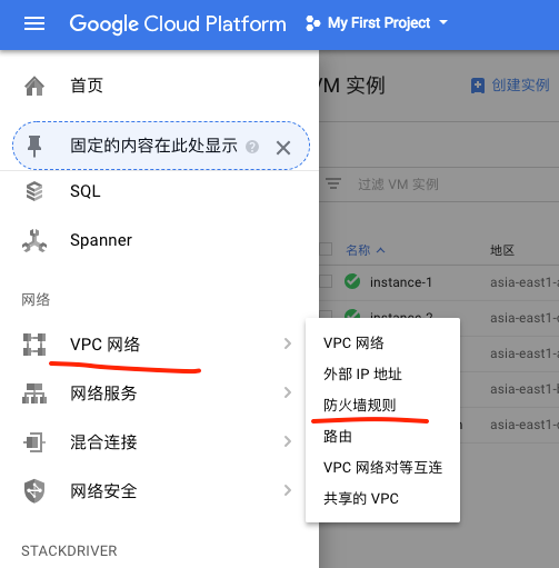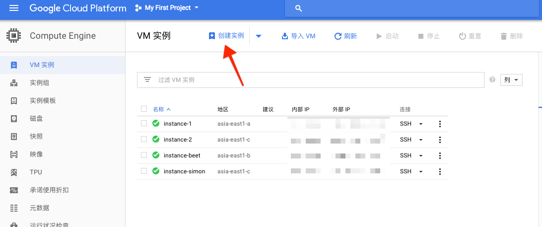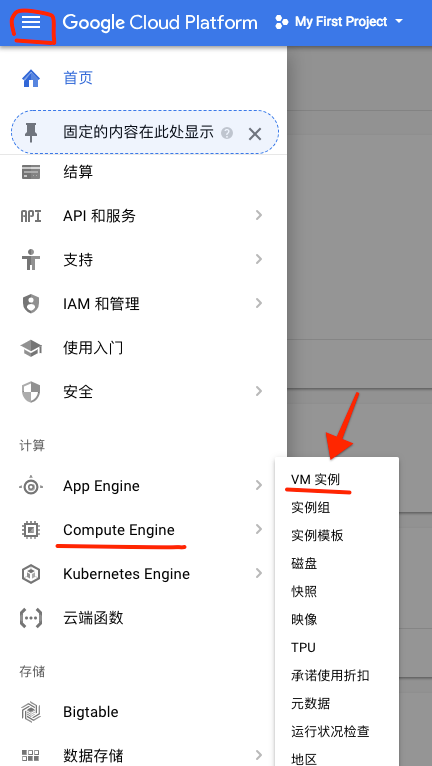 继续点击左边的导航栏,选择Compute Engine -> VM实例来创建一个实例,