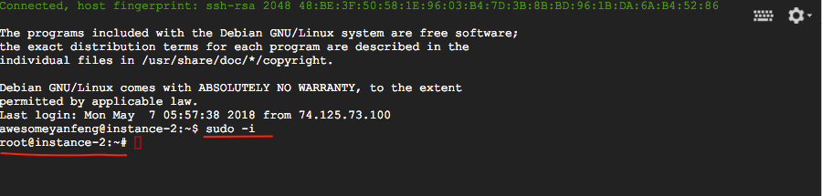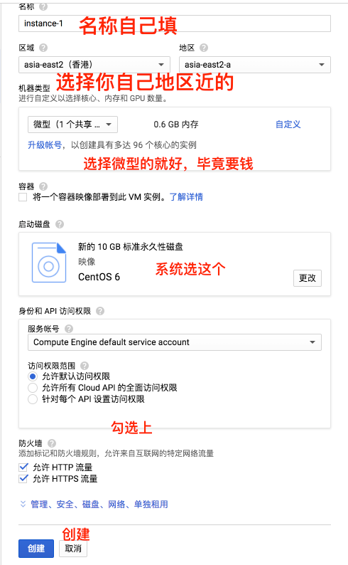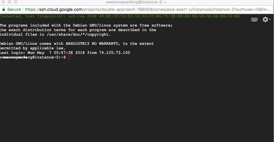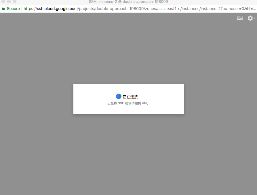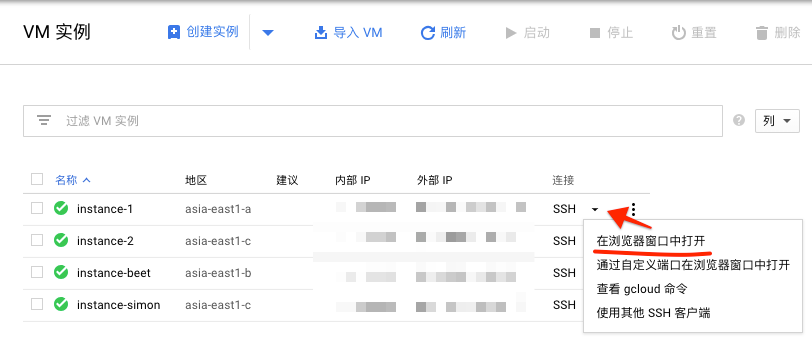 按照图中的标注,填写配置信息。然后就转入VM实例的页面,点击 SSH 右边的箭头后选择在浏览器窗口中打开,会在另外窗口打开控制程序: