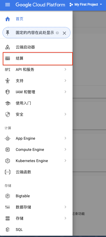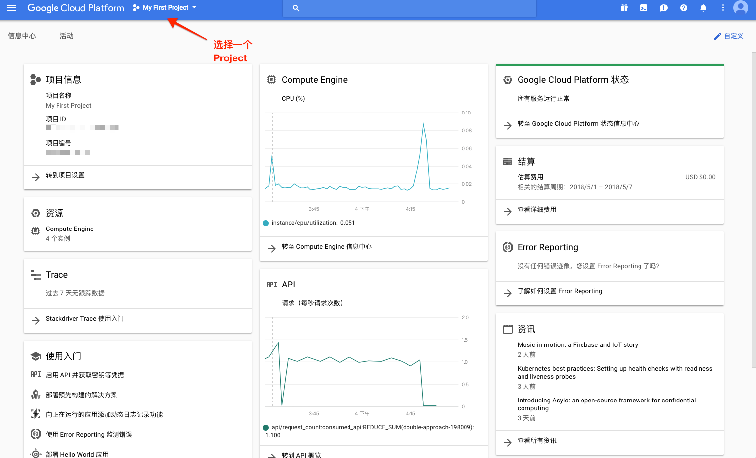 你们的页面可能不一样,根据图中点击红色箭头的区域,然后选择My First Project(这个是默认会创建的,如果没有的话就自己创建一个)。