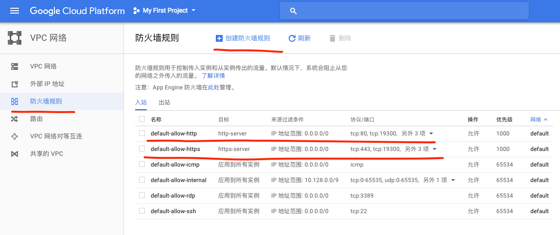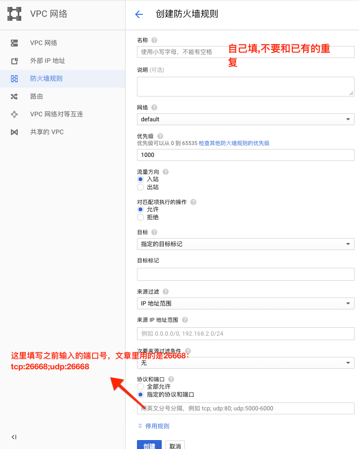 点击创建防火墙规则,按照图中填写,主要是端口号,记住名称不要和已有的重复了。