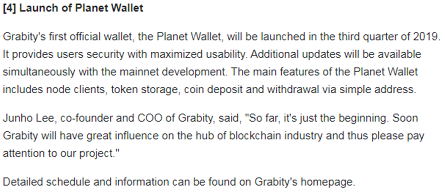 Grabity의 최초 공식 지갑 인 Planet Wallet은 2019 년 3 분기에 출시 될 예정이며 사용자 보안을 극대화 한 유용성을 제공합니다. 추가 업데이트는 메인 넷 개발과 동시에 사용할 수 있으며. Planet Wallet의 주요 기능에는 노드 클라이언트, 토큰 저장, 간단한 입금을 통한 동전 입금 및 출금이 포함된다고 합니다.