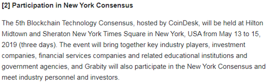 야후파이낸스에서는 또한, CoinDesk 이 주최하는 제 5 회 Blockchain Technology Consensus 가 미국 뉴욕의 힐튼 미드 타운과 쉐라톤 뉴욕 타임즈 스퀘어에서 2019 년 5월 13일부터 15일까지 열릴 예정이라고 합니다. 이 행사에는 주요 산업계 기업, 투자 회사, 금융 서비스 회사 및 관련 교육 기관 및 정부 기관이 모일 것이며 그래비티는 뉴욕 컨센서스에 참가하고 산업 인사와 투자자들을 만날 수 있을 것이라고 합니다.