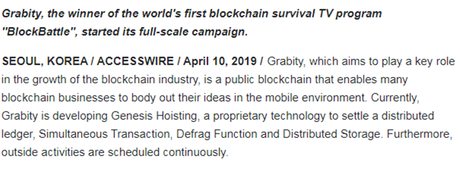 야후파이낸스 기사의 첫부분은 그래비티는 세계 최초로 진행한 블록체인 생존 프로그램인 블록배틀의 우승자로 본격적인 캠페인을 시작했습니다 라는 문구로 시작이 되고 있습니다.