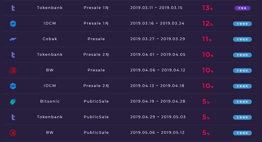 그래비티 얼리버드 세일 1차~3차를 2018.11.19일 부터 2019.01.13까지 각각 비트소닉, 토튼뱅크에서 진행되었으며 현재 비트소닉에서 프리세일 1,2차를 마치고 토큰뱅크에서 프리세일 1차를 진행하고있습니다.