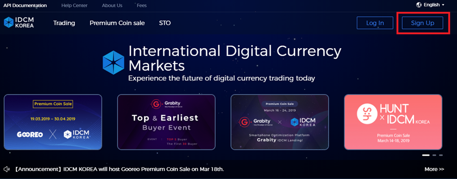 IDCM 거래소는 국내 거래소가 아니기에 그래비티코인 구매시 다른 방식으로 구매를 해야합니다. IDCM 거래소에 가입을 합니다. IDCM 거래소 (https://www.idcmkorea.io/)에 접속하셔서 회원가입 절차를 진행합니다.
