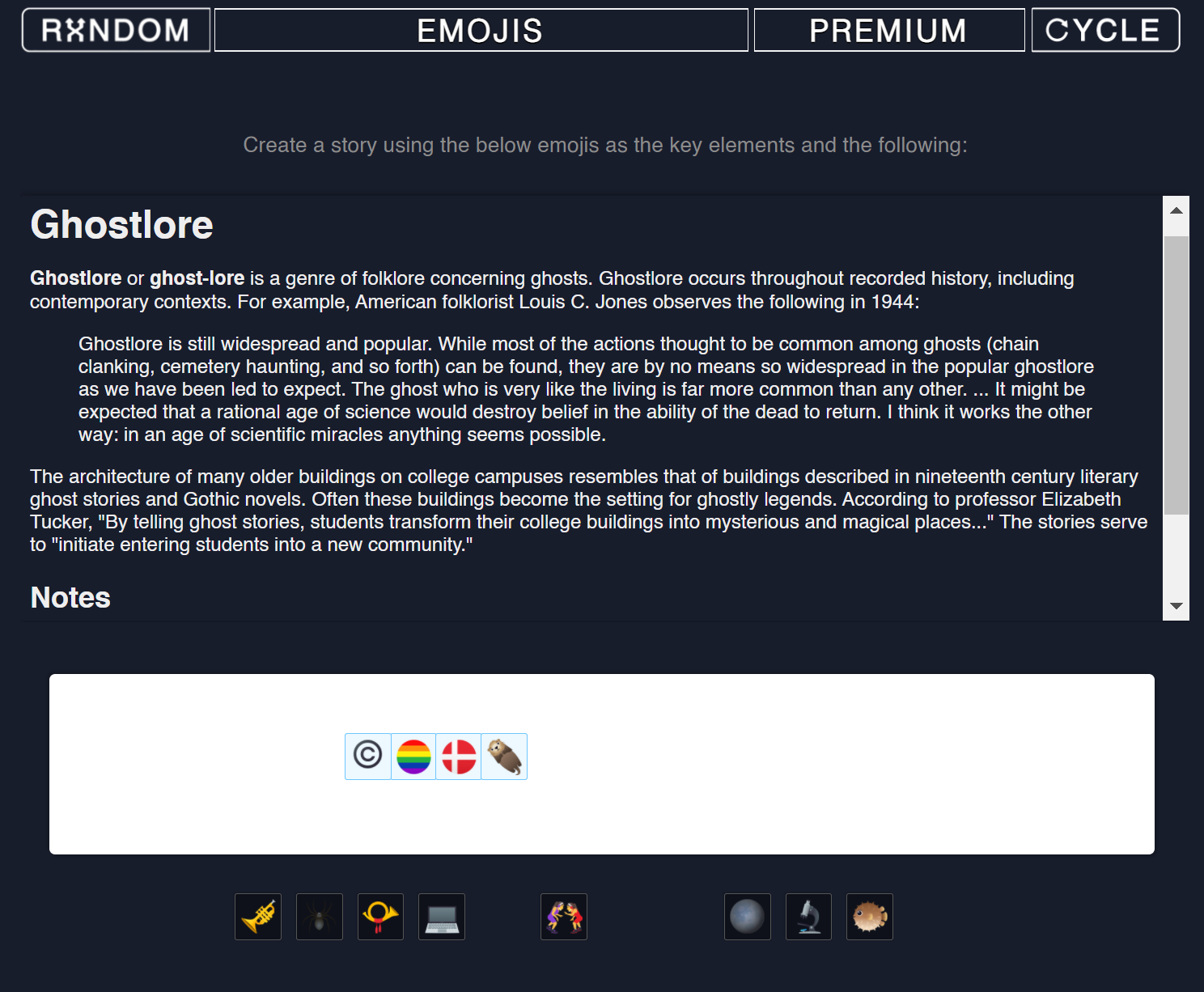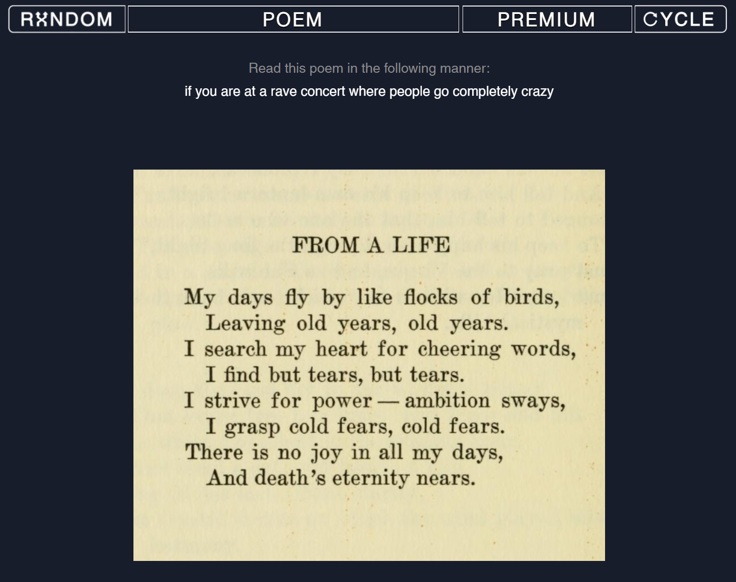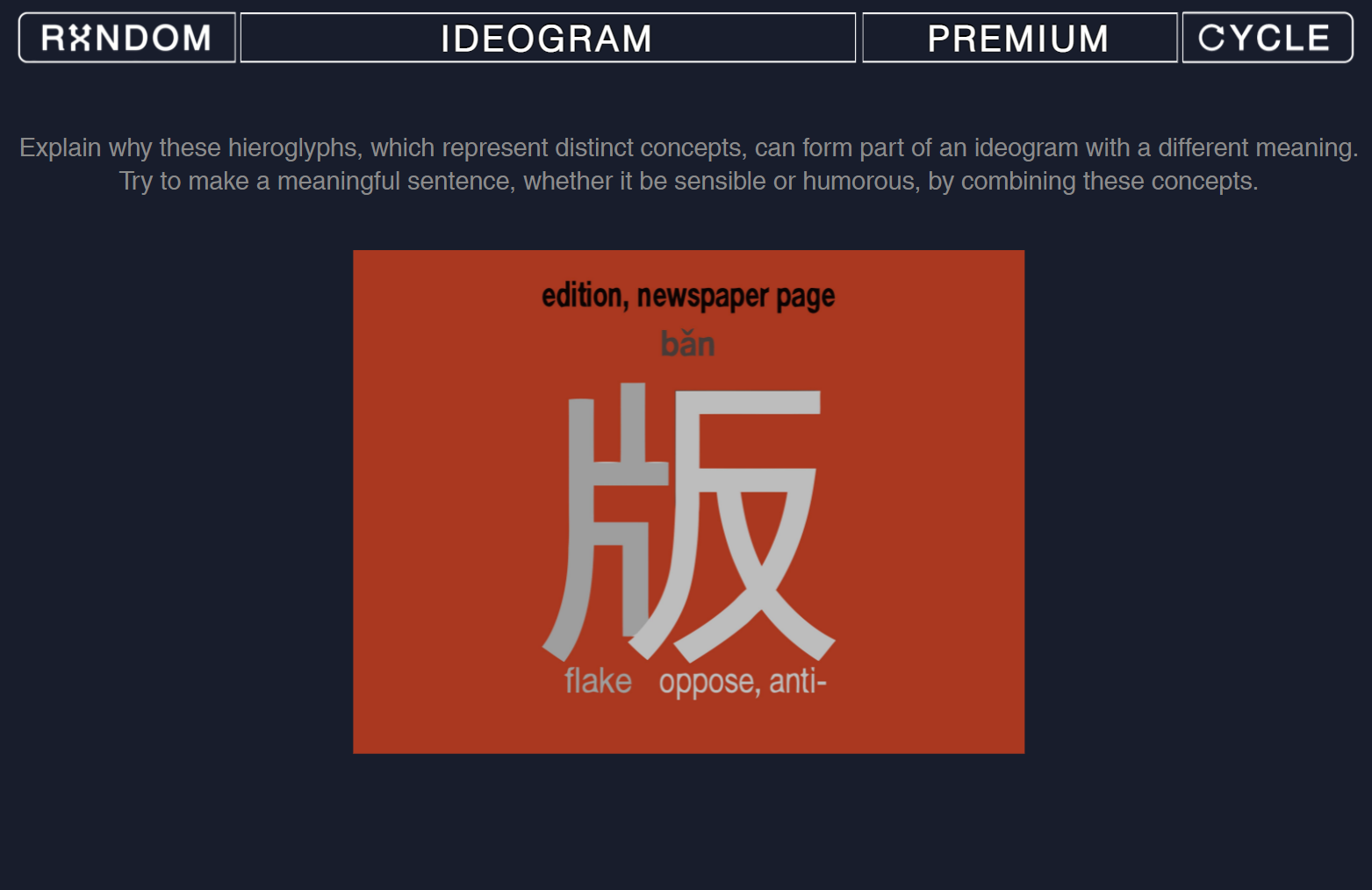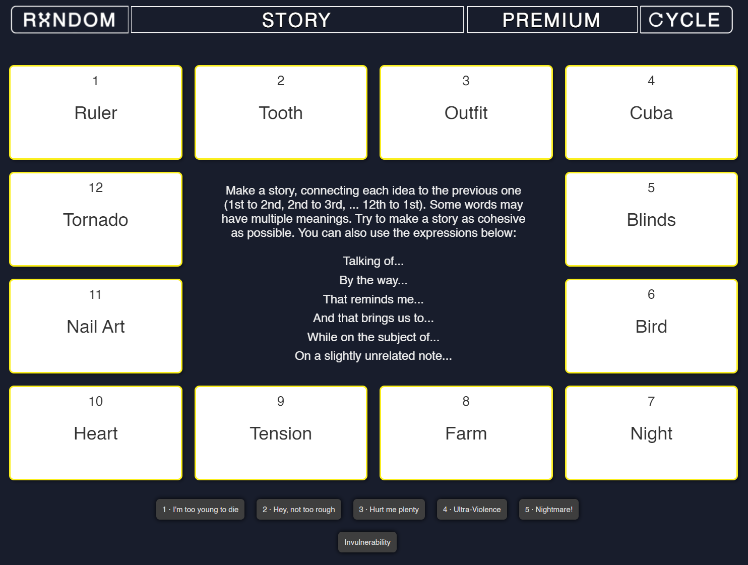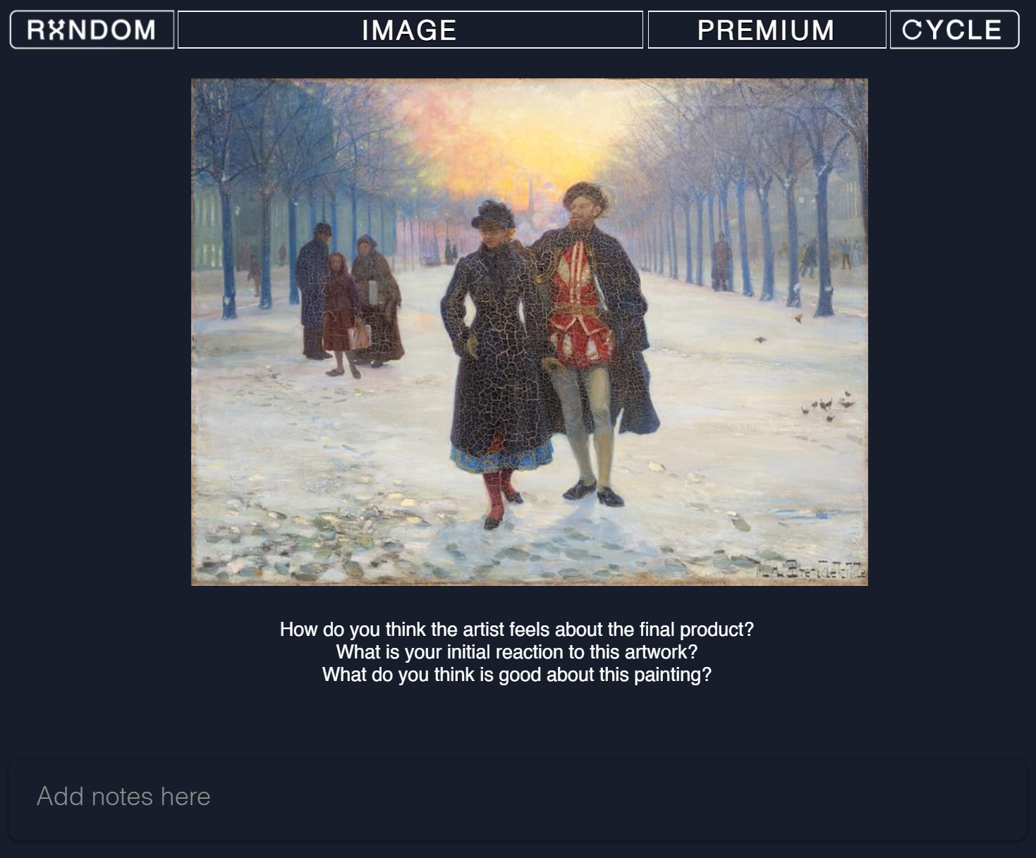 Keeping things simple. "CYCLE" and "RANDOM" are the only buttons. Facilitators don't need to prepare or study any materials before a session as they need to know no more than the participants. The "Random" button will likely generate content both parties will not be familiar with. Randomness and novelty are always present, and answers can be spontaneous.