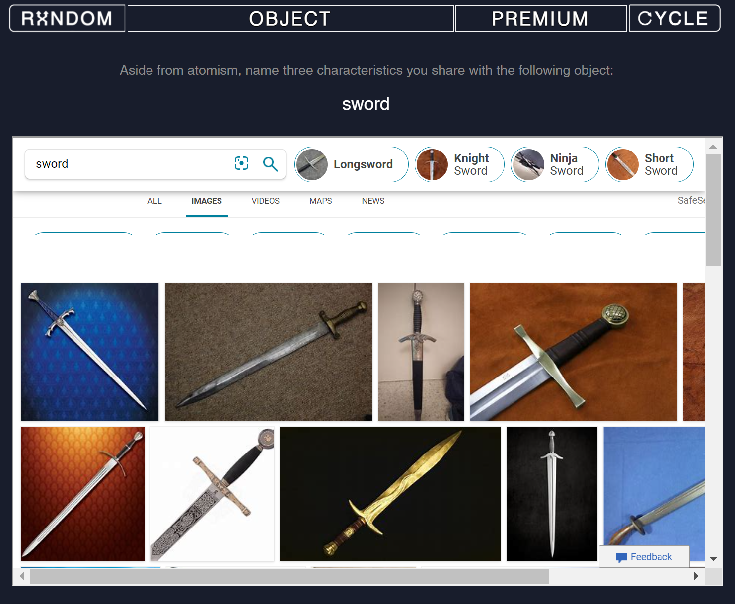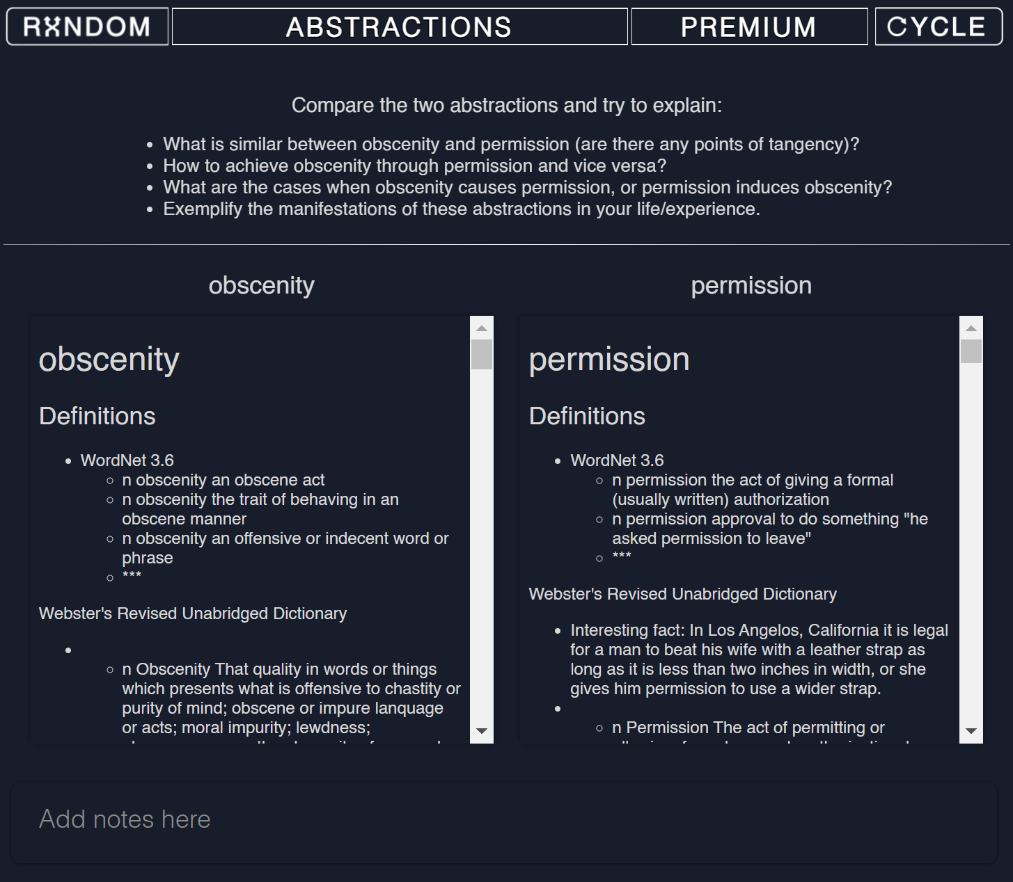 We have designed an activity that lets you generate two abstractions at random and to compare them by using bisociation, a method coined by Arthur Koestler, and synectics. By using metaphors to connect seemingly unrelated elements, the synectics approach to problem solving demonstrates the importance of a metaphorical approach to problem solving. Various scientific works on neuroplasticity describe the basic technique of combining unrelated concepts.