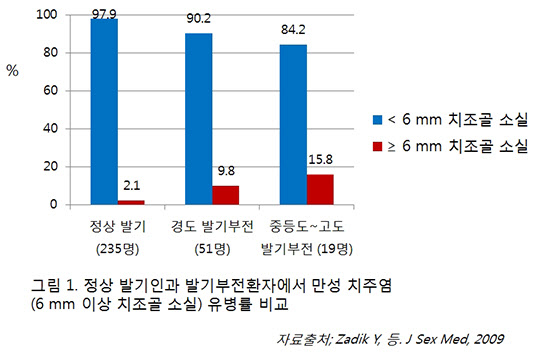 2009년 이스라엘 하다싸-히브루대학병원 연구팀은 평균 연령 39.5세의 남성 305명을 대상으로 발기부전과 만성 치주염의 유병률을 조사한 결과, 만성 치주염은 정상 발기 남성보다 발기부전환자에서 더 많이 발생하는 것을 발견하고 만성 치주염이 발기부전의 위험인자가 될 수 있다고 처음으로 보고했다(그림 1).